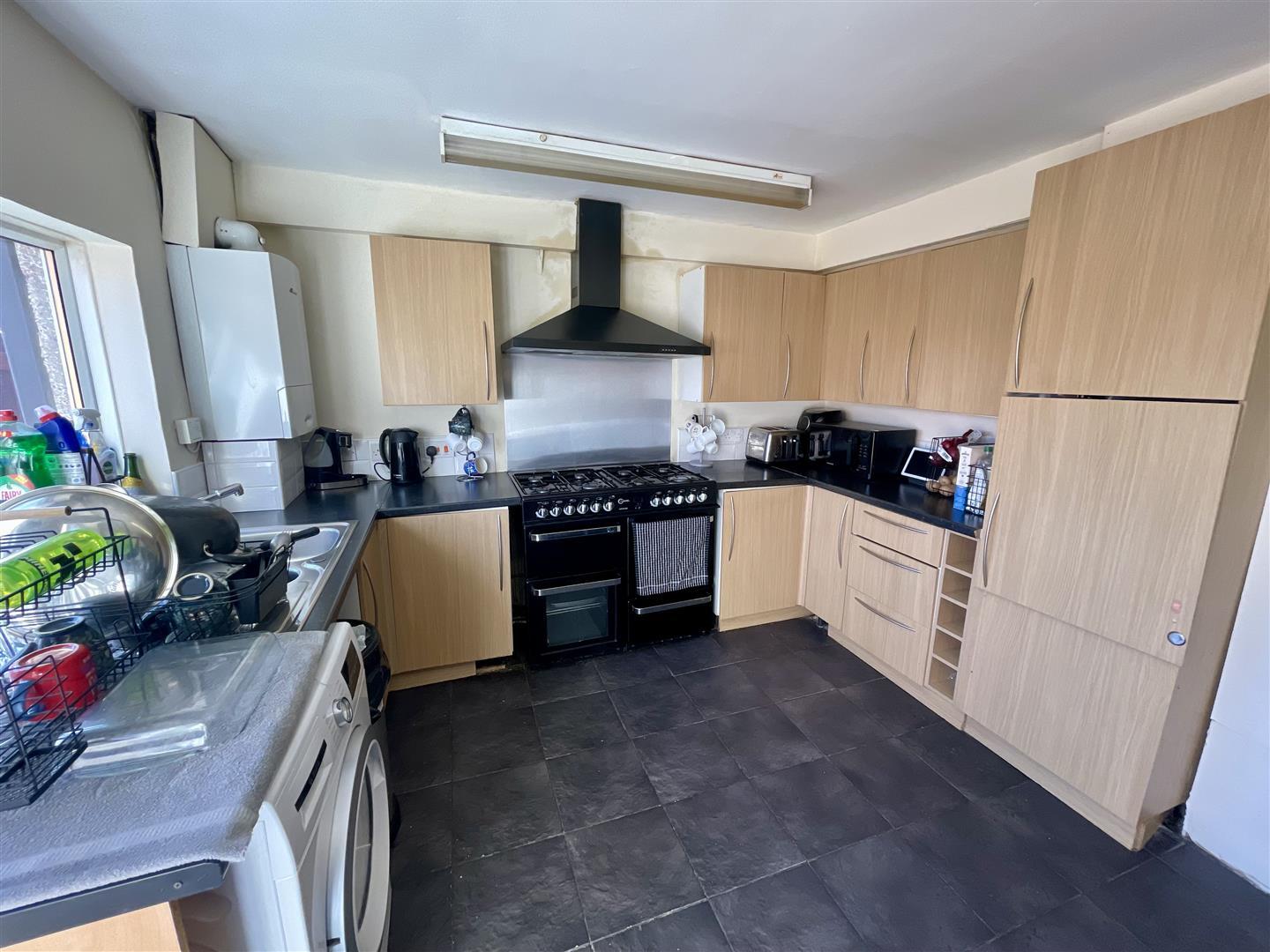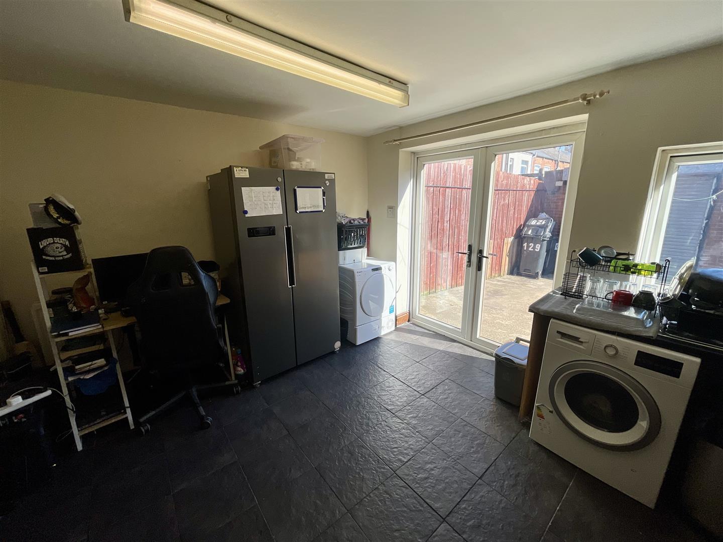 Upvc double glazed window to rear, fitted with wall, base and drawer units, stainless steel sink unit, space for a cooker, American style fridge freezer and washing machine. French doors to rear.