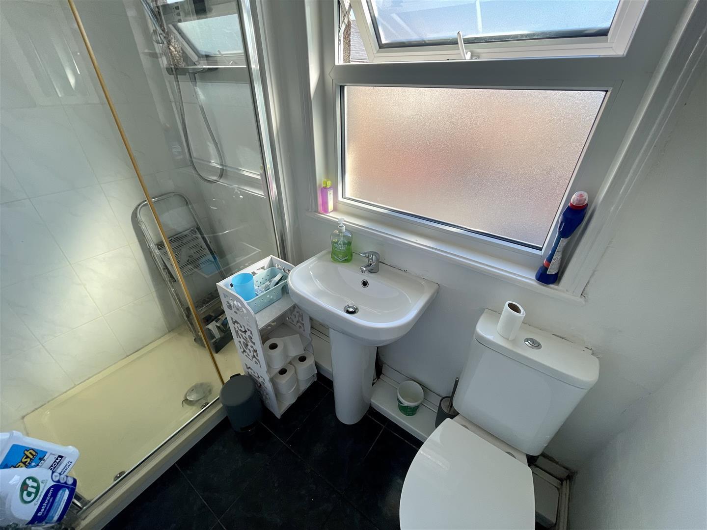 Upvc double glazed obscure window to rear, shower cubicle, w.c, wash hand basin and heated towel rail.
