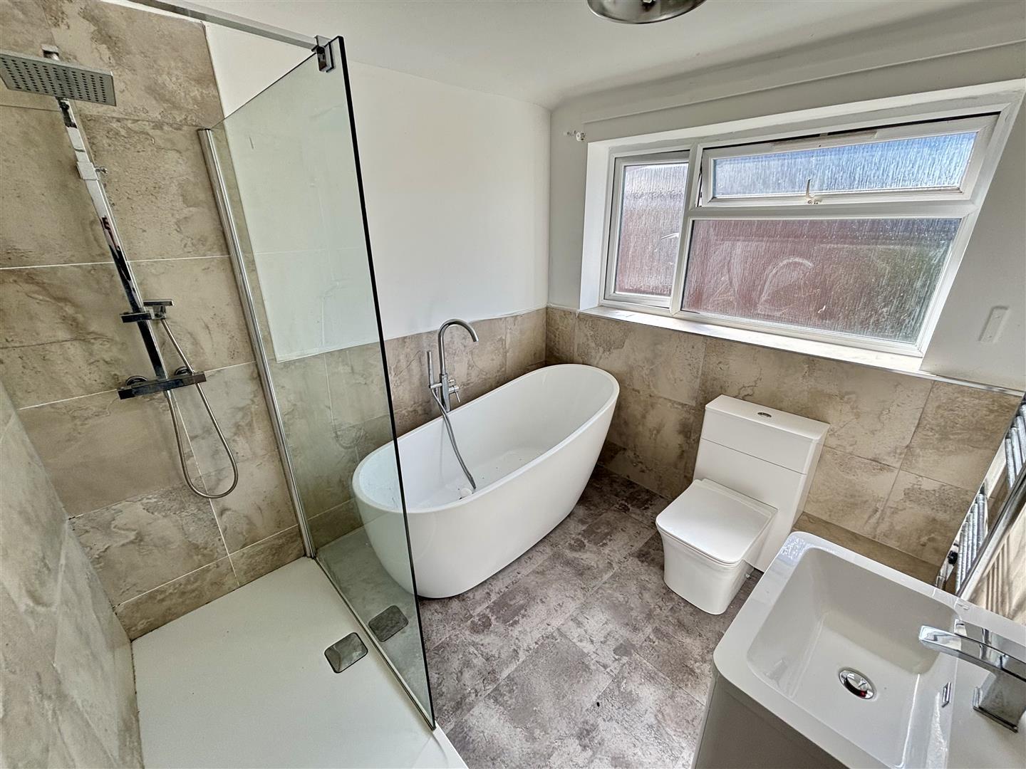 Stylish family bathroom comprising of a freestanding bath with mixer shower, walk-in cubicle with mains fed shower, a hand wash basin set to a vanity unit, WC, heated towel rail, tiled splashbacks and UPVC double glazed opaque window to the rear.