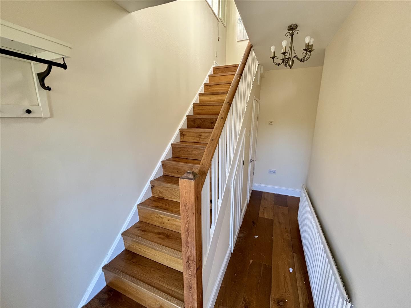 Welcoming entrance hallway with staircase leading to the first floor, an understairs cupboard, wood laminate flooring and radiator.
