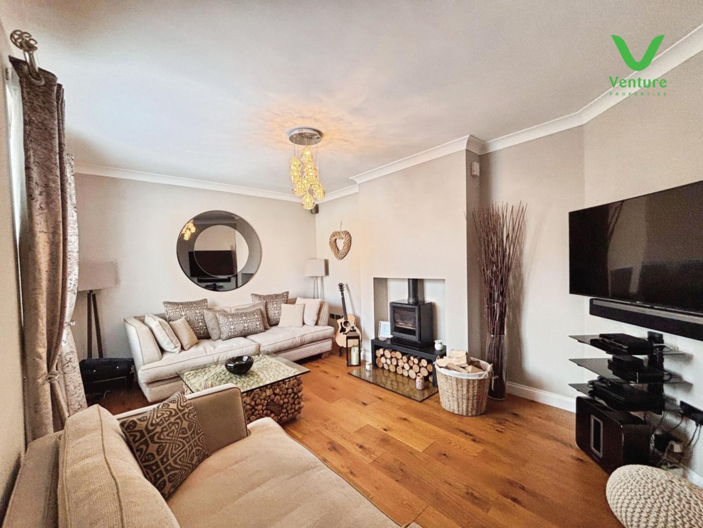 Having feature fireplace housing multi burning stove, solid oak flooring, central heating radiator and upvc double glazed window to front.