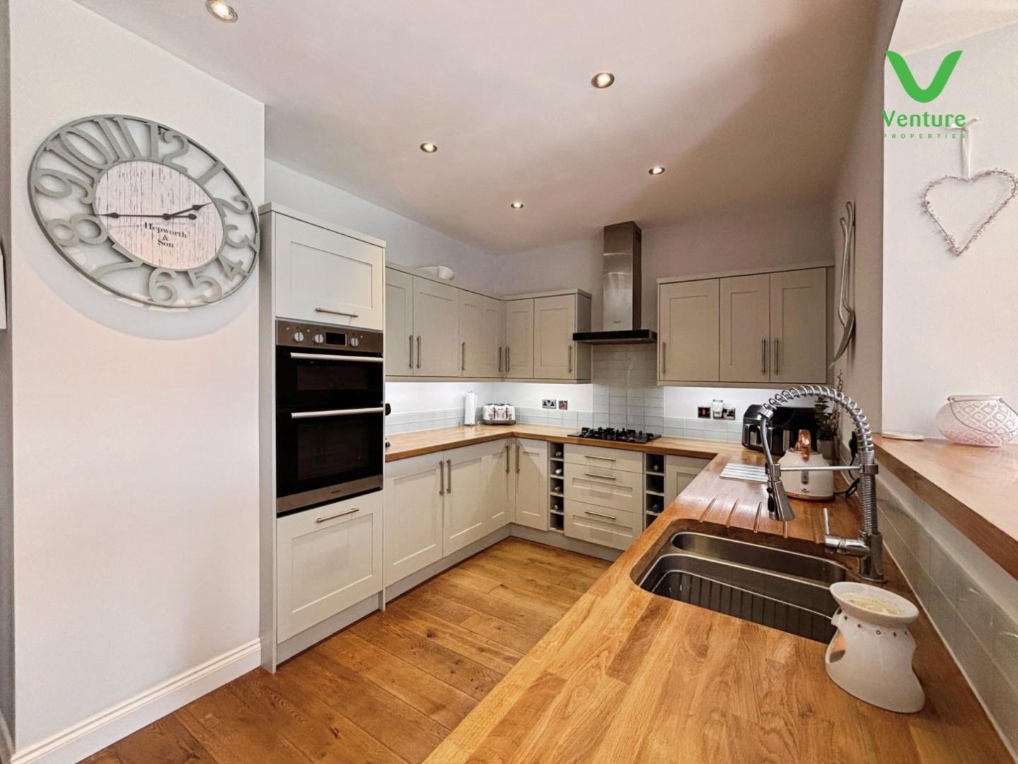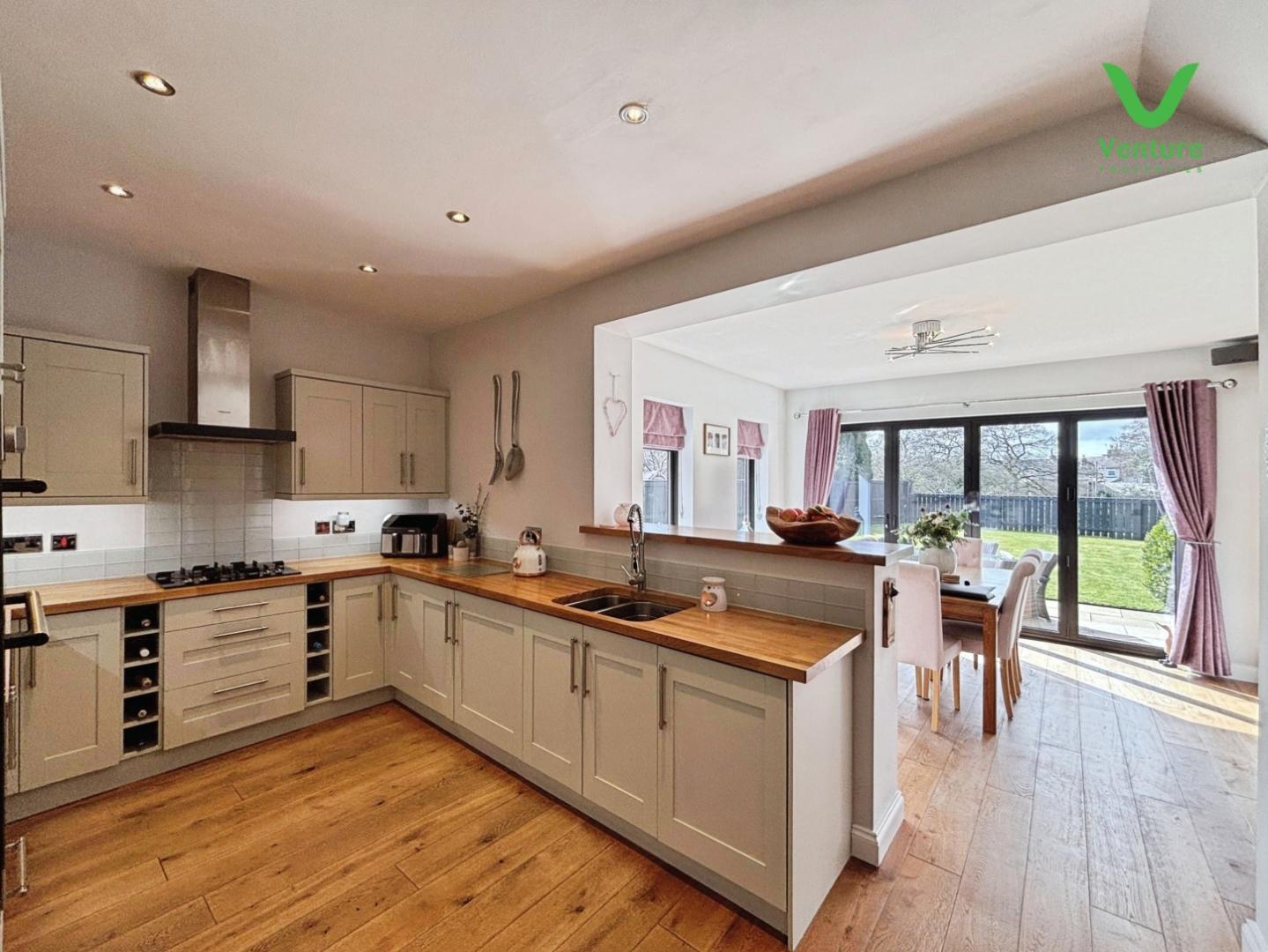 Fitted with a quality kitchen comprising of walk and base units having solid wood worktops over, sink unit and drainer, eye level electric oven and gas hob, spot lighting to ceiling, space for fridge freezer, breakfast bar, stoarge cupboard housing gas boiler and opening into the garden room.