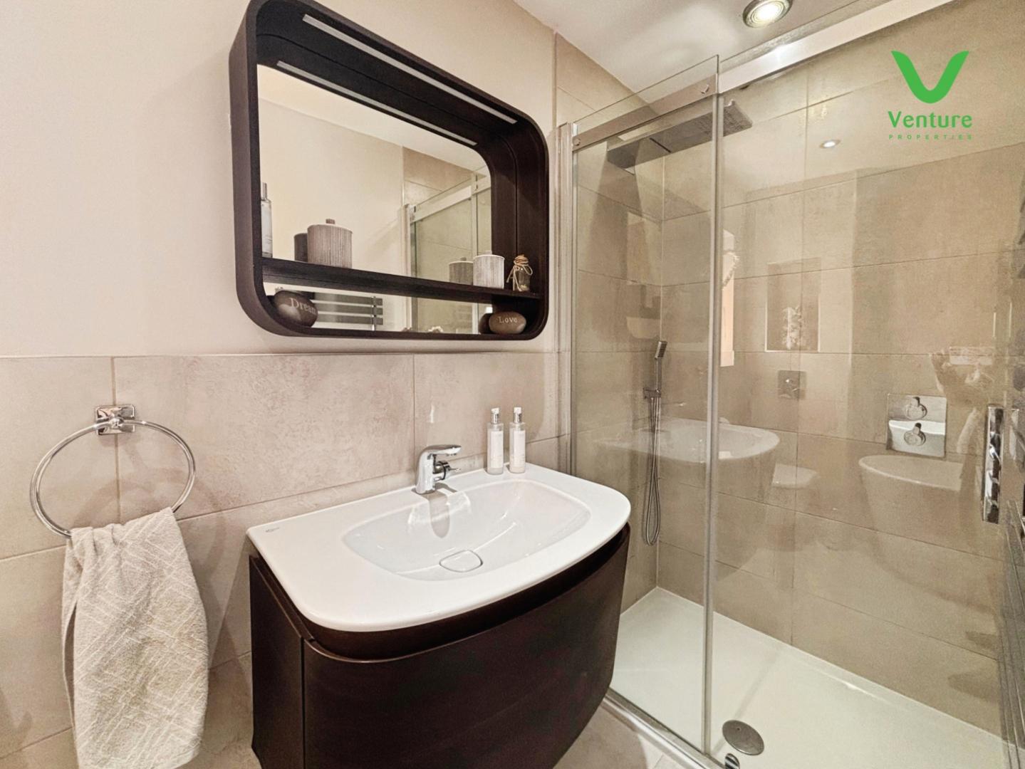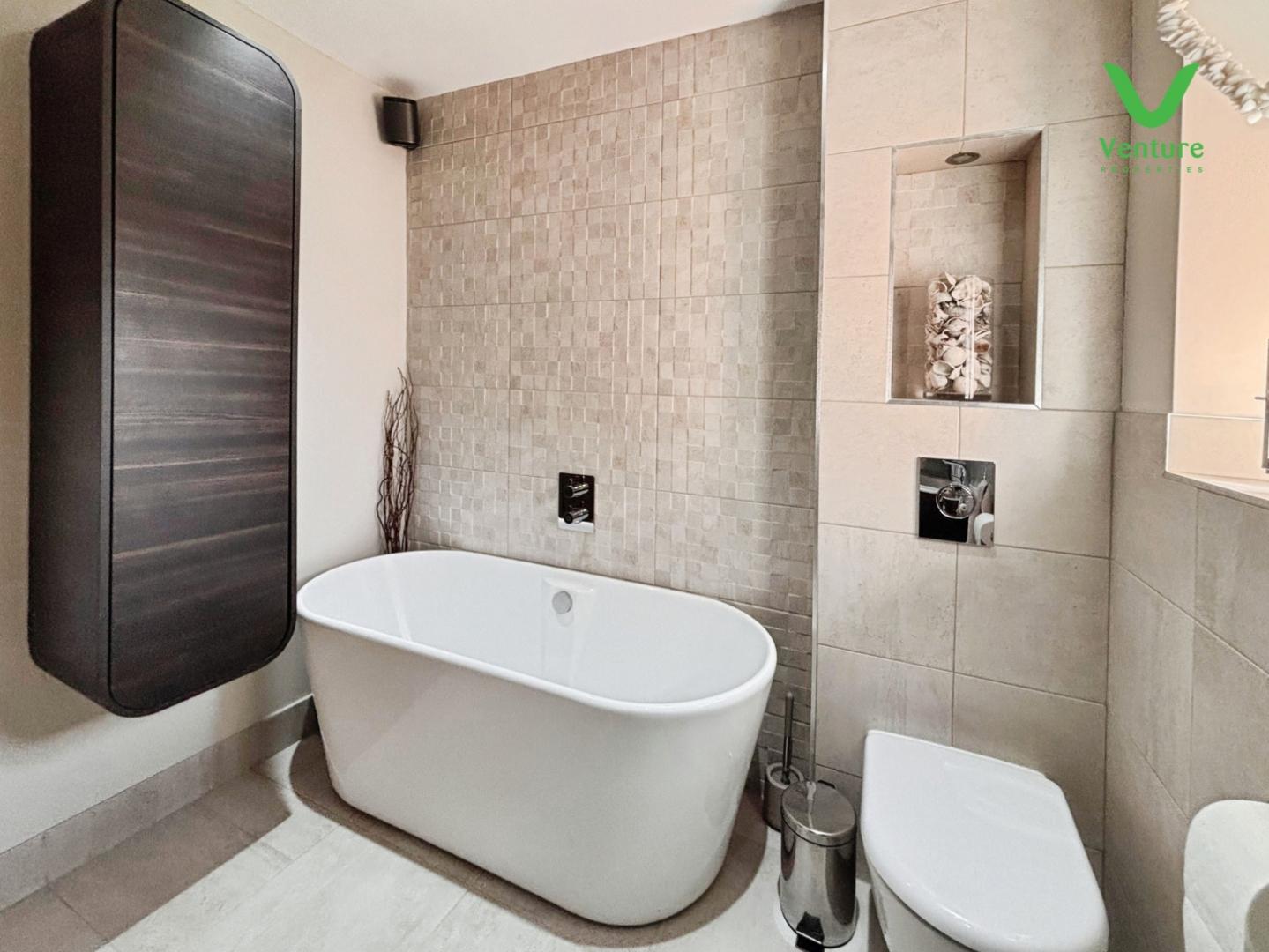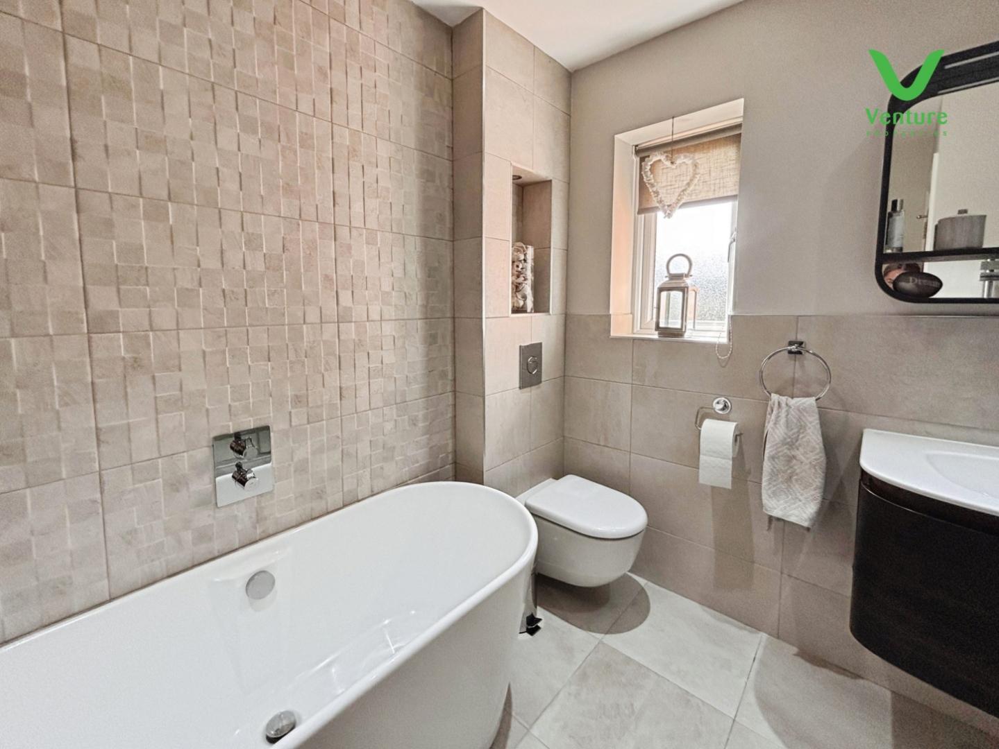 Fitted with a luxury bathroom suite comprising of a free standing bath, double shower unit having mains shower over, heated towel rail, wc, wash hand basin set to vanity unit.