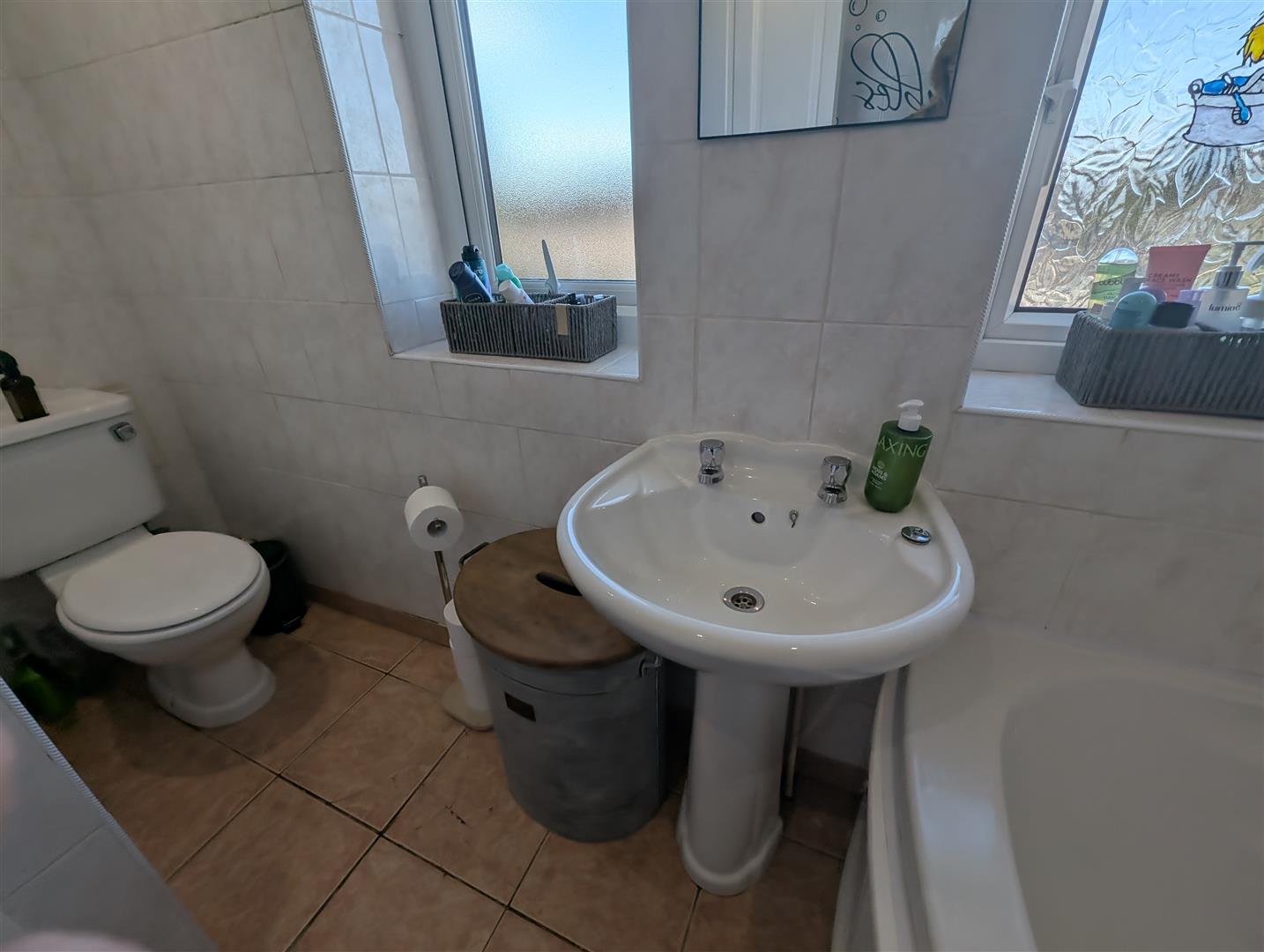 Two windows to rear, corner bath with shower over and spray. Low level w.c and wash hand basin. Heated towel rail and fully tiled walls.