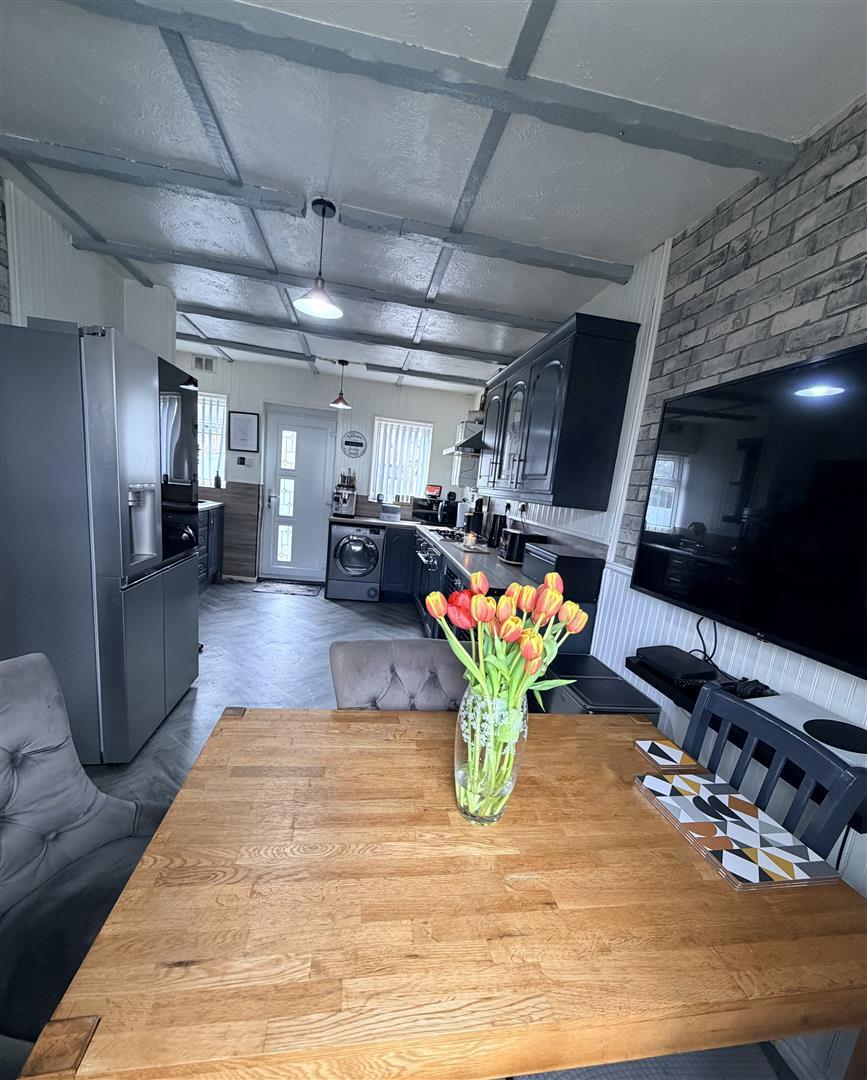 Window to front, two windows and door to rear, fitted with wall, base and drawer units, stainless steel sink with mixer tap. Four ring hob with extractor over and oven. Space for a fridge freezer, washing machine and table and chairs. Storage cupboard and tiled floor.