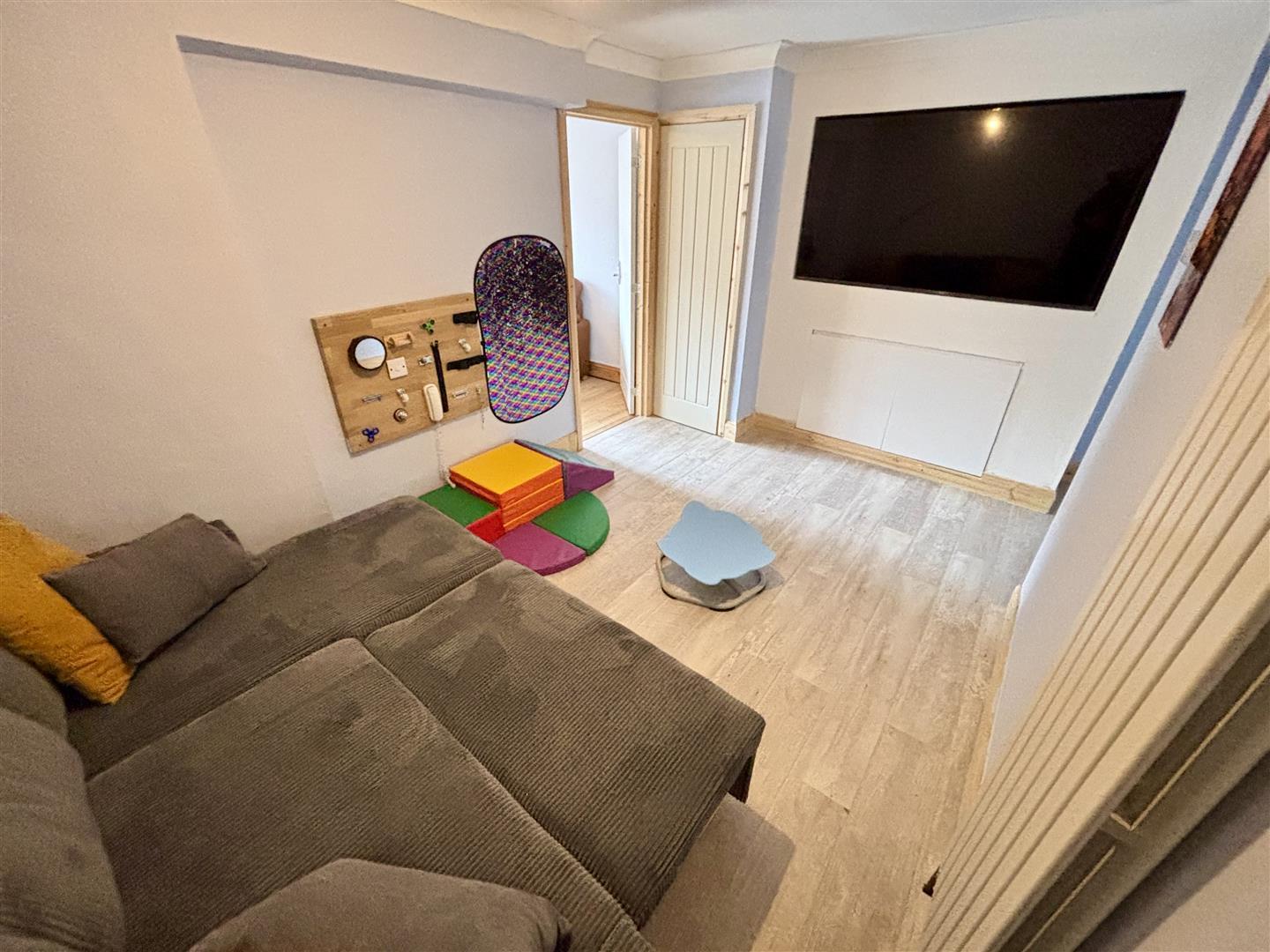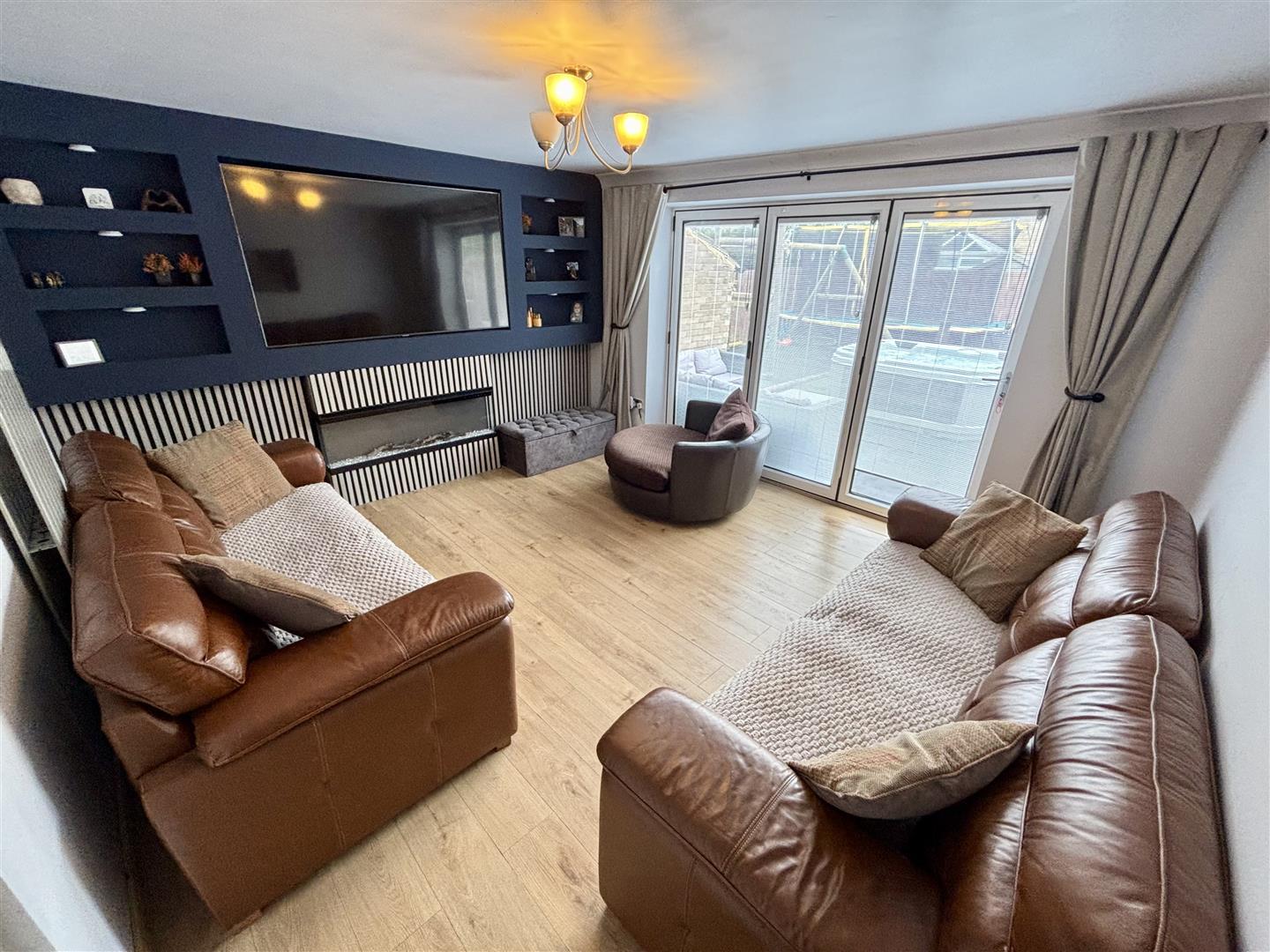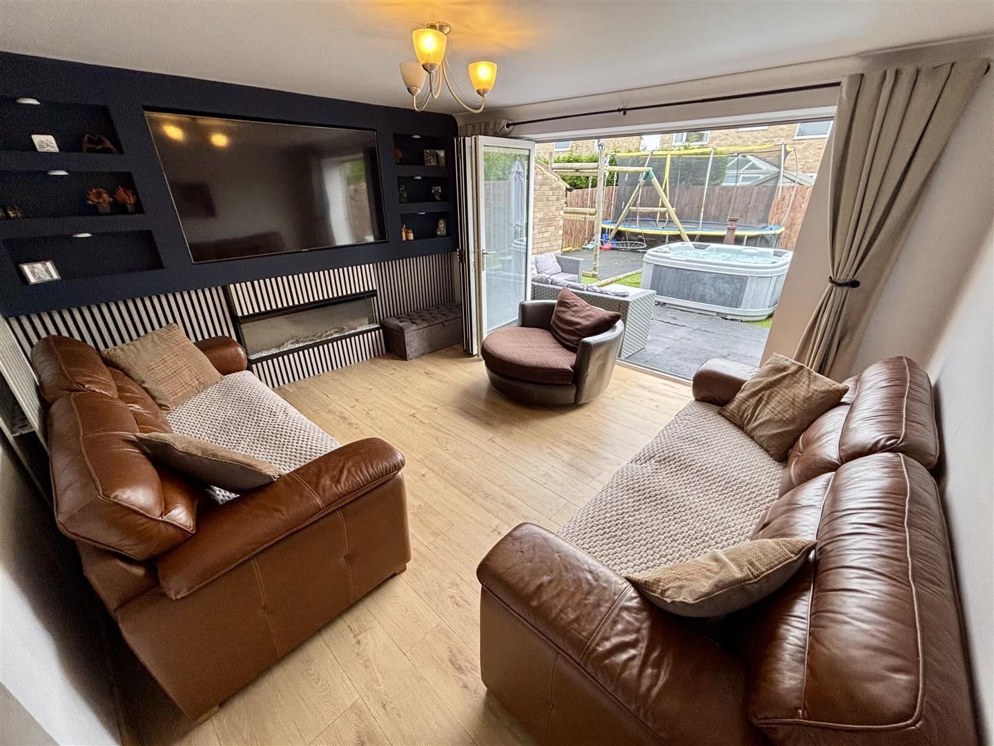 An excellent addition to the property with bi-fold doors opening to the rear garden, a media wall with inset fireplace, wood laminate flooring and a wall panel radiator.