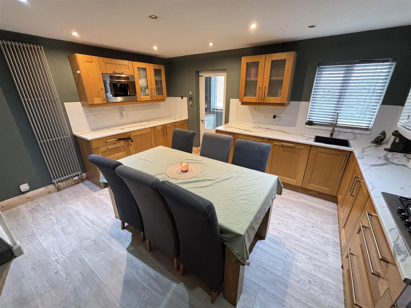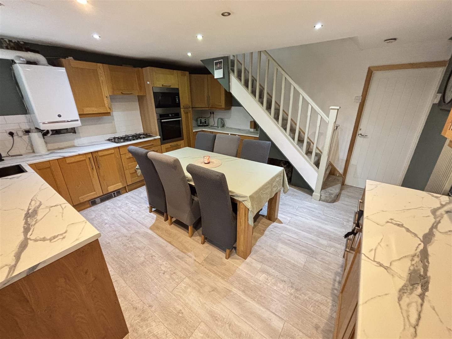 Fitted with a range of wall and floor units having contrasting worktops incorporating a sink and drainer unit with mixer tap, a built in stainless steel oven hob with extractor over, as well as two integrated fridges, a freezer, dishwasher, washing machine and microwave. Further features include recessed spotlights, laminate flooring, a space heater, stairs leading to the first floor and UPVC double glazed window to the front.