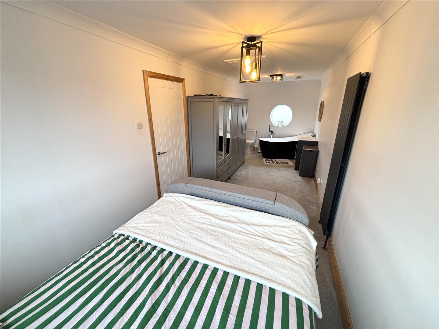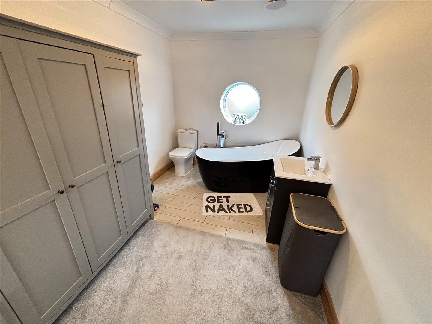 An impressive master bedroom suite which has a UPVC double glazed window to the rear, a feature circular window to the front and wall panel radiator. There is an open plan ensuite with a contemporary freestanding bath, a hand wash basin set to a vanity unit and WC.