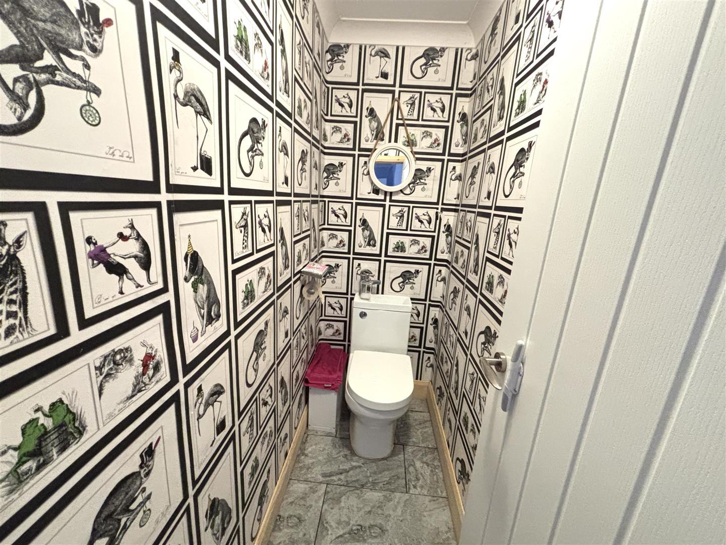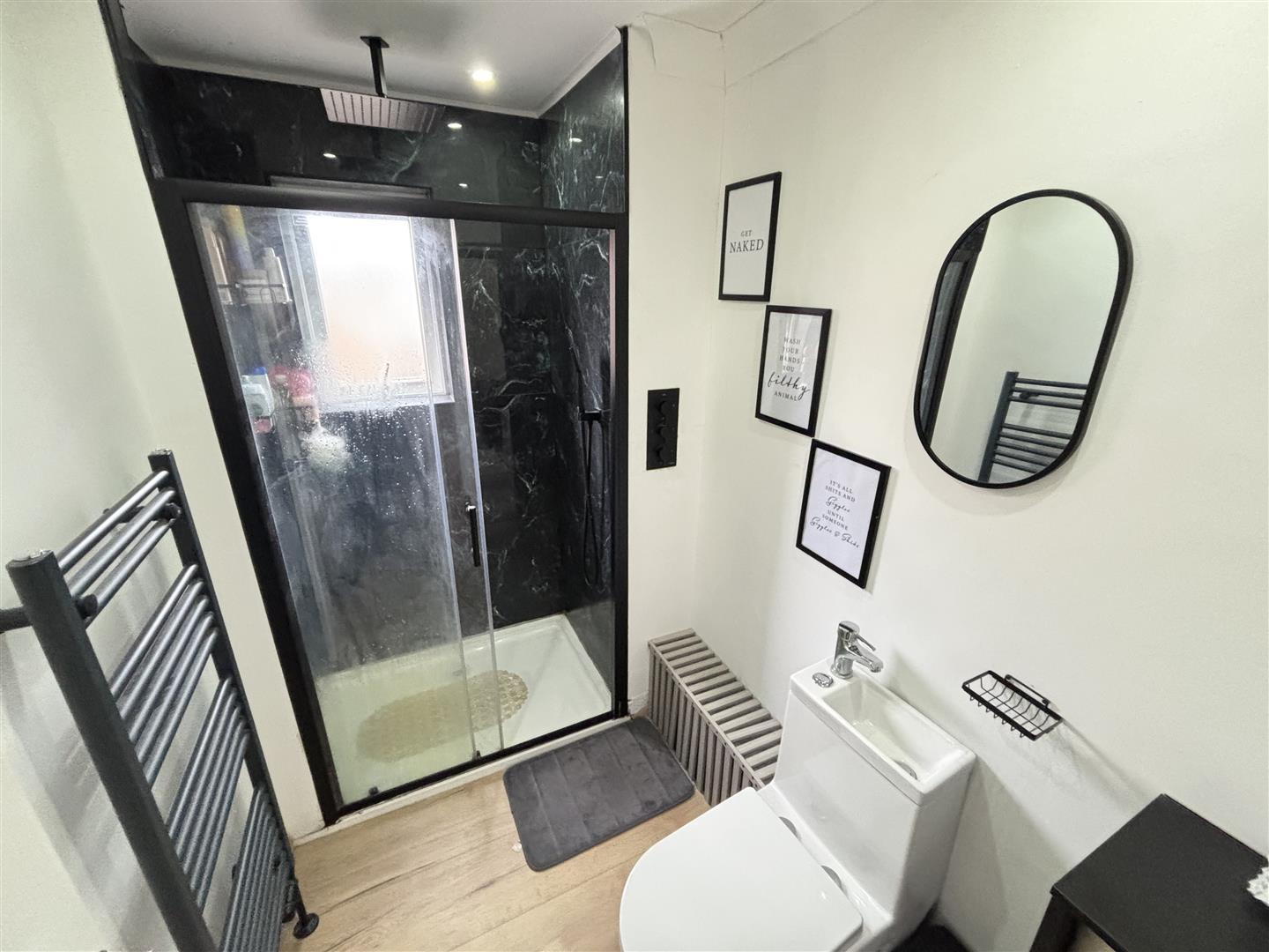 Modern refitted shower room comprising of a cubicle with mains fed rainfall shower, a WC with hand wash basin, heated towel rail, recessed spotlighting and UPVC double glazed opaque window to the front.