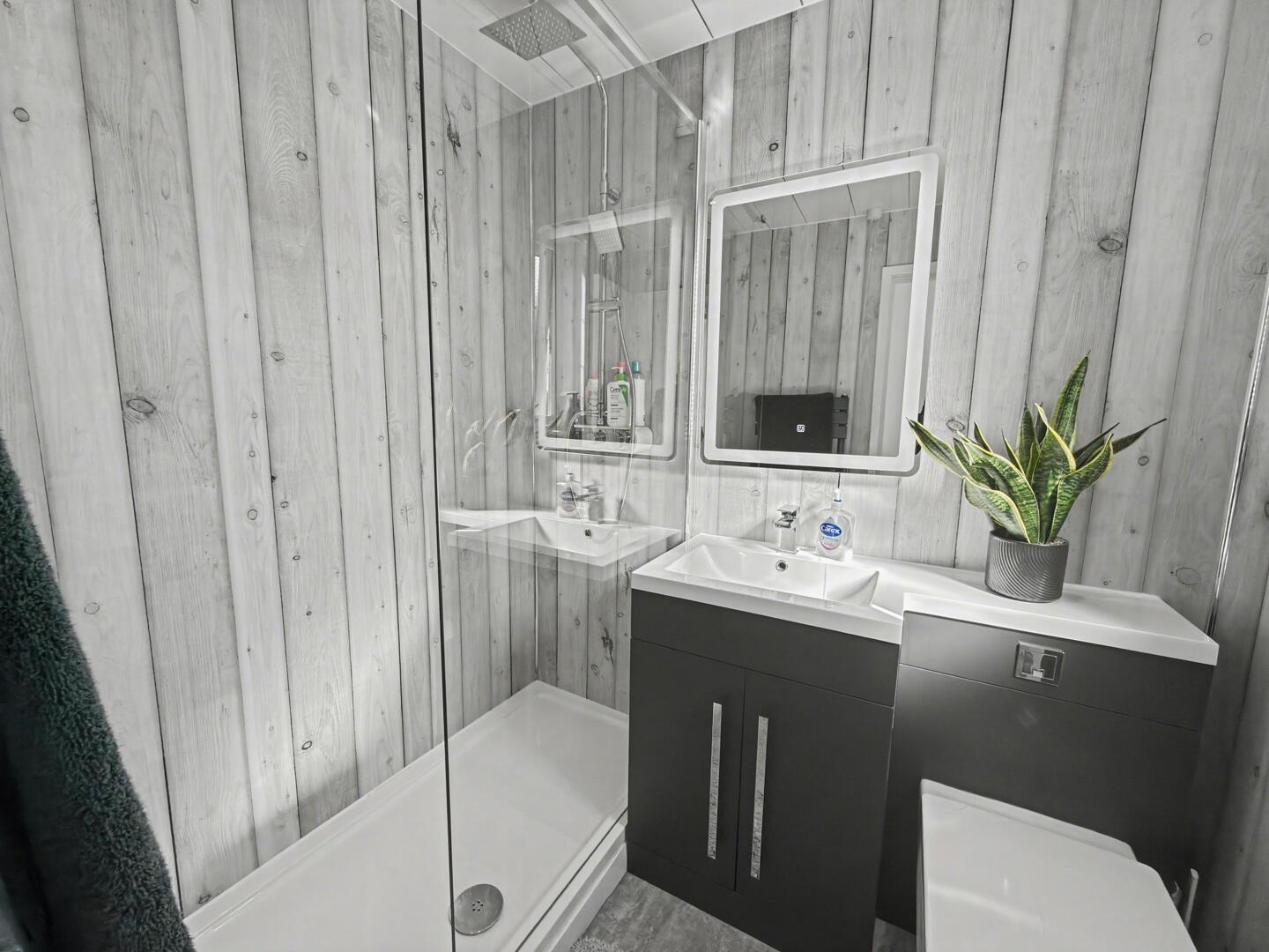 A refurbished suite with walk in shower, wash hand basin and low level WC.