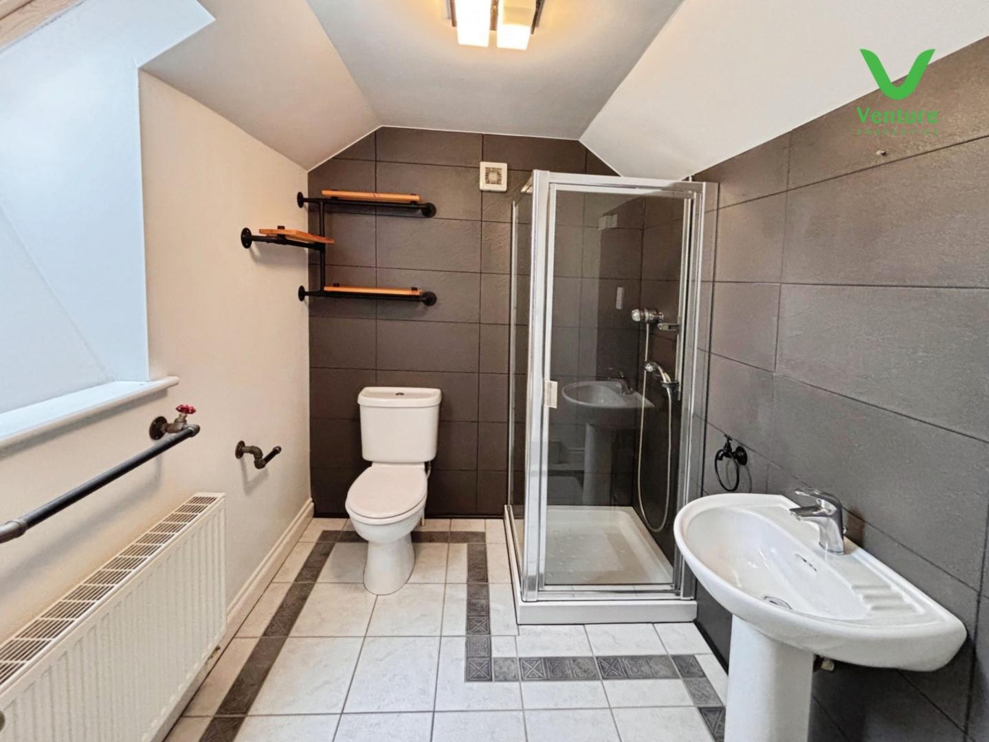 Fitted with a three piece suite comprising shower, WC, wash hand basin, velux roof light, tiled flooring, extraction fan and central heating radiator.