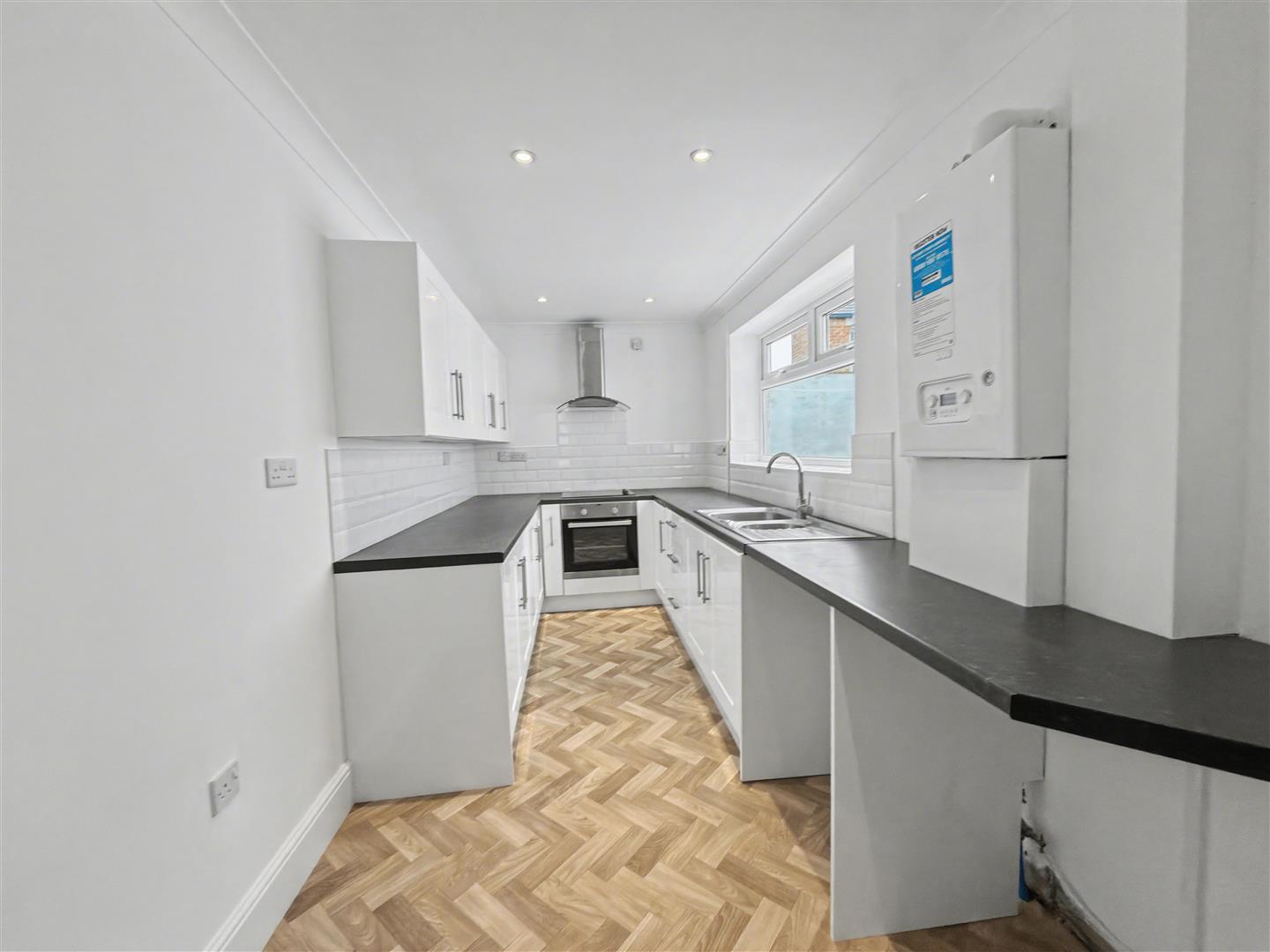 This bright and practical kitchen features a sleek, modern design with white cabinetry and dark countertops. The space is well lit by a large window, enhancing the herringbone patterned flooring that adds a touch of character. There is ample counter space and integrated appliances, creating an efficient area for cooking. Integrated oven and hob with overhead extractor unit, plumbing connections for an automatic washer and wall mounted boiler.