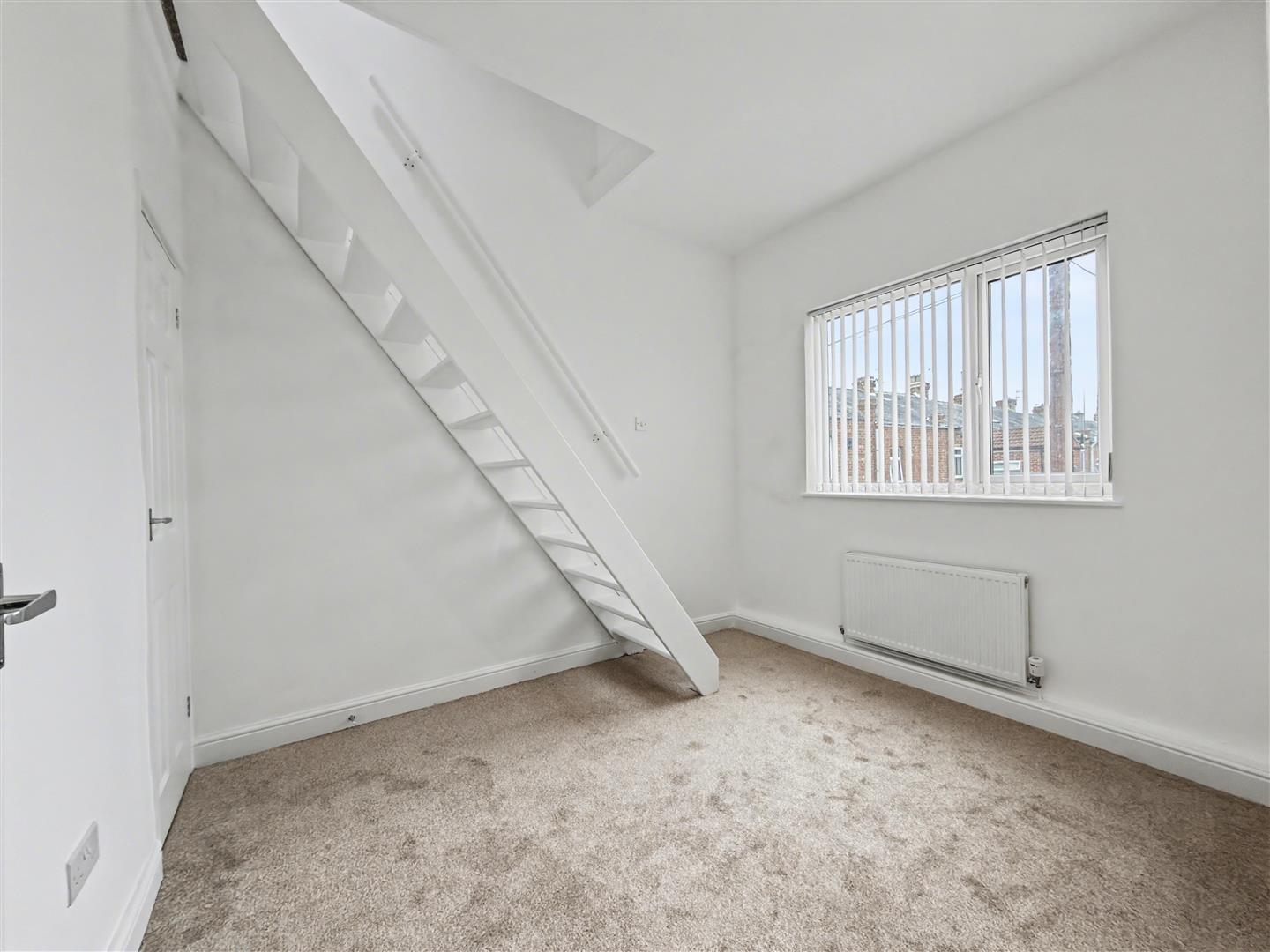 Bedroom 2 offers a cosy and inviting space with carpeted flooring and a window allowing natural light to enter. The room features a staircase leading to the attic above, adding character and additional storage or living potential.