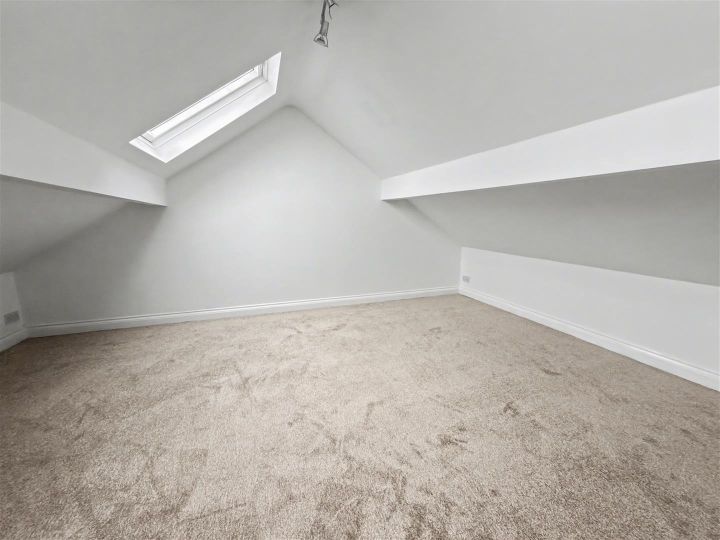 The attic is a versatile, carpeted space with a pitched ceiling and a skylight window, allowing natural light to flood in. Its neutral décor and open plan provide an ideal area for storage.