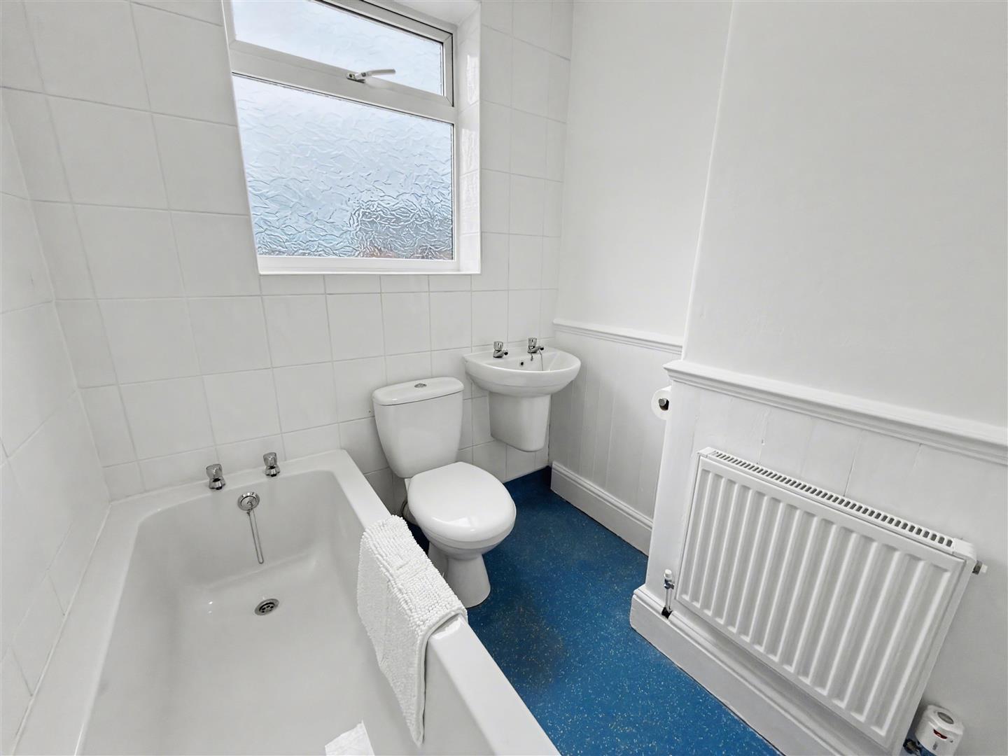 The bathroom is neatly arranged with a white suite including a bathtub, toilet, and wash basin. A frosted window ensures privacy while allowing natural light to gently illuminate the space. The room has a practical layout with tiled walls around the bath area and a radiator for added comfort.