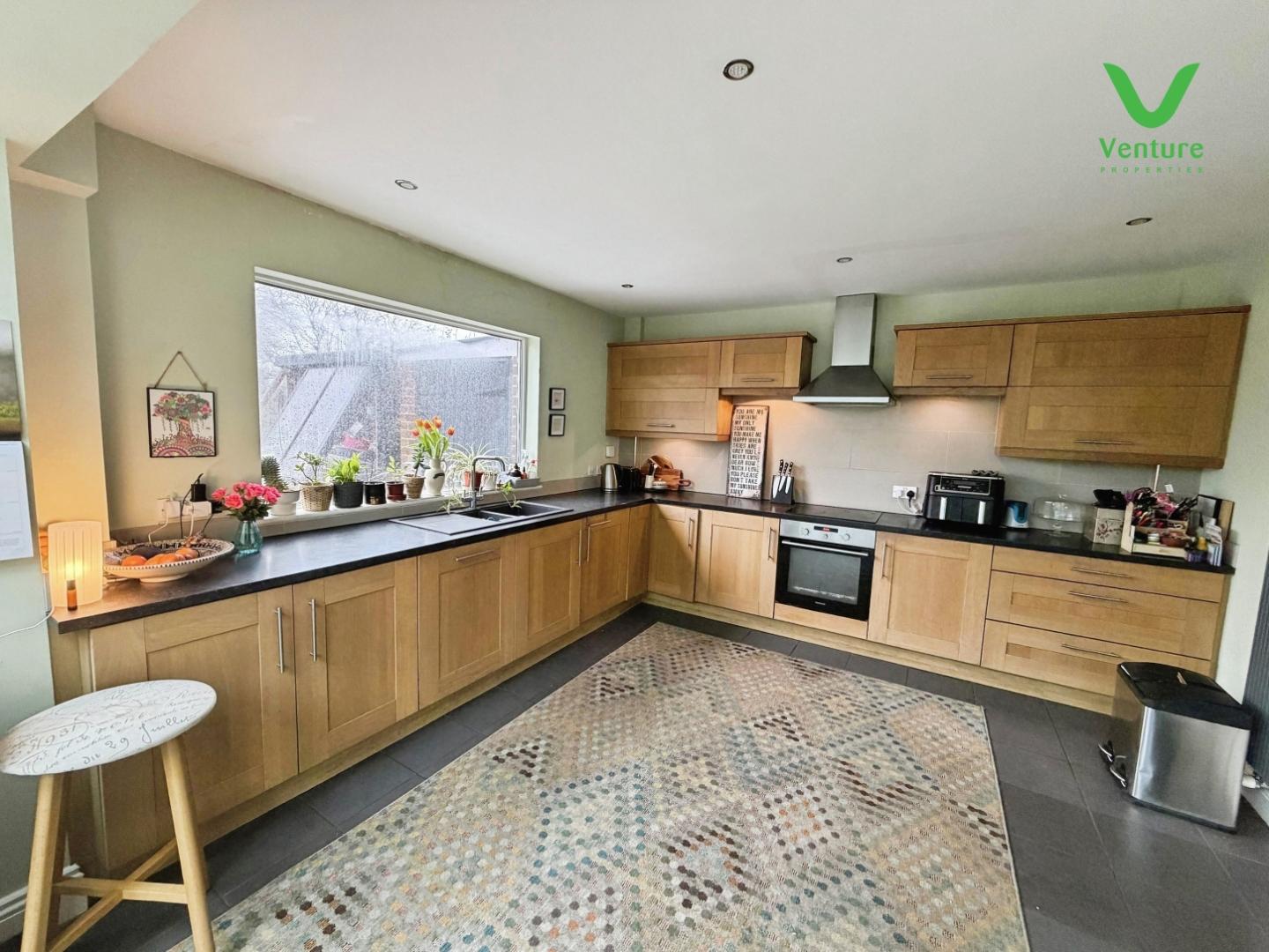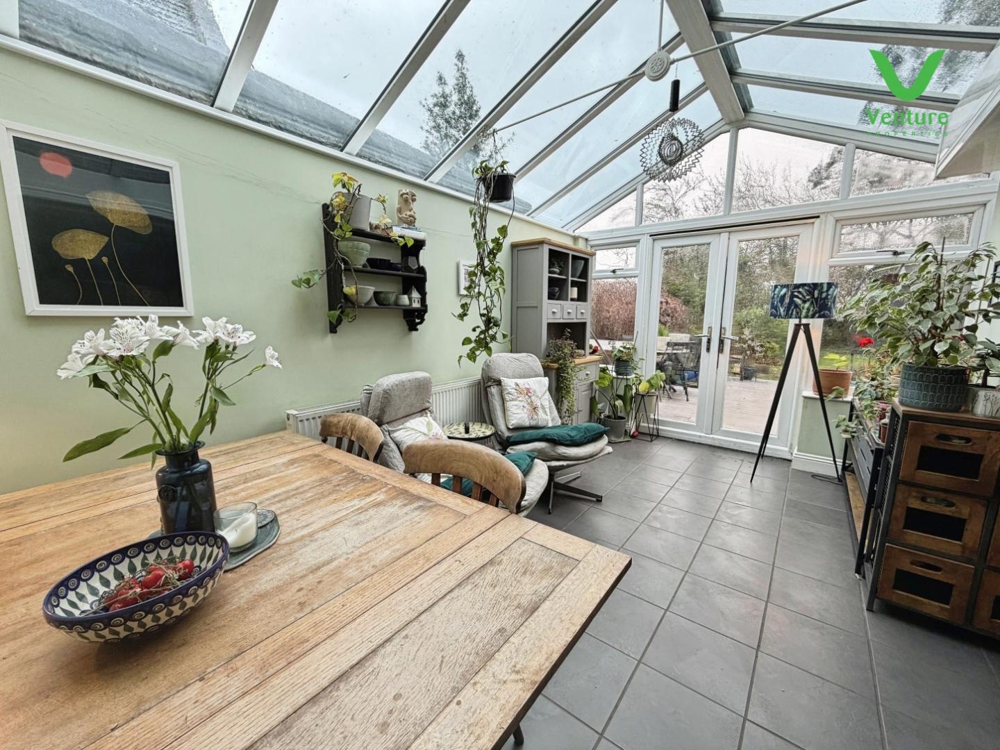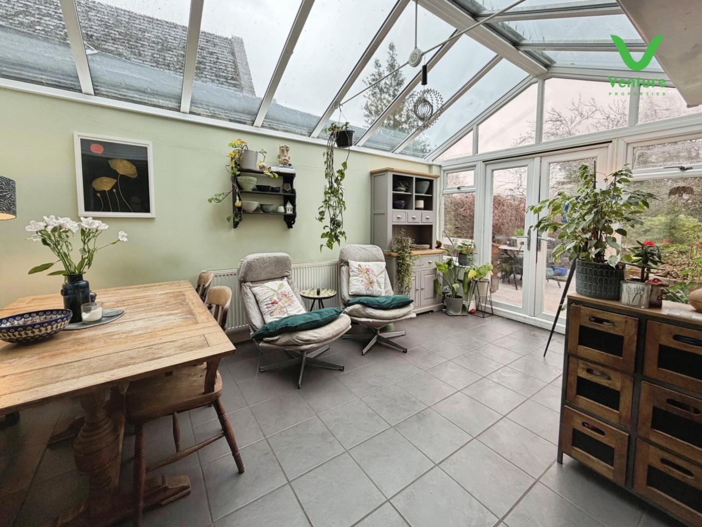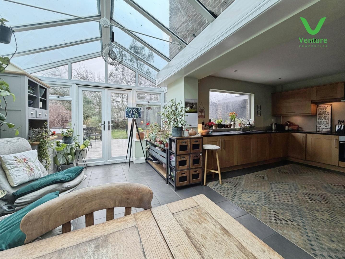 A lovely Kitchen and Garden room combined over looking the rear garden. The kicthen area is fitted with a range of wall and baae units with contrasting work surfaces over, inset one nad a half bowl sink unit, mixer taps over, UPVC double glazed window, a range of integrated appliances including electric oven and hob, plumbing for washing machine and dishwasher, tiled flooring, central heating radiator and patio doors opening out into the garden. Ample space for a large dining table as required