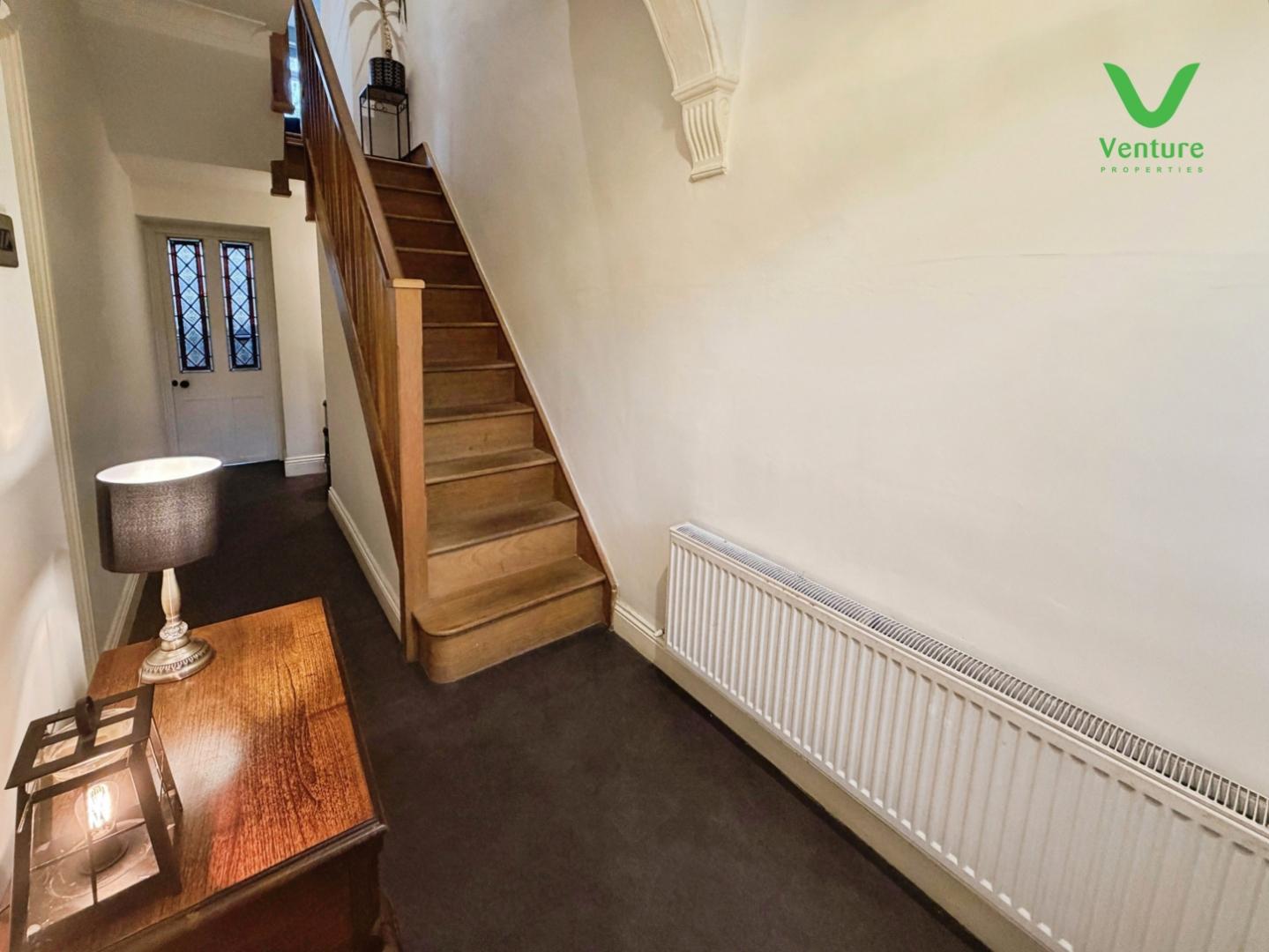 A traditional hallway having tiled flooring, central heating radiator , stairs rising to first floor.