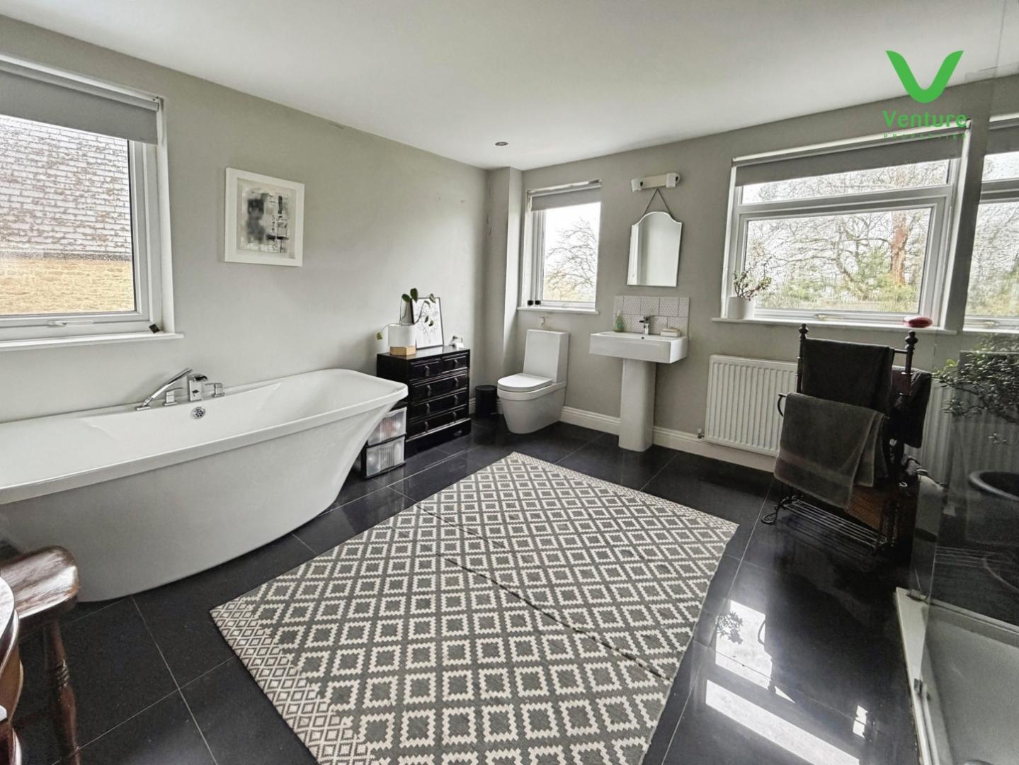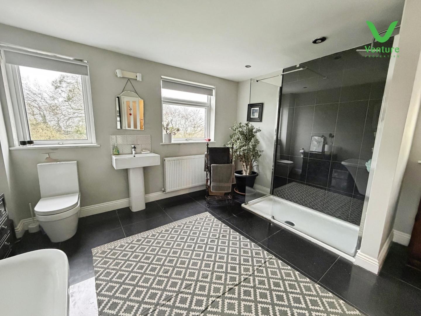 A superb room and is extensively fitted with a white suite including free standing bath, wc, pedestal wash hand basin, extra large walk in shower cubicle with mains waterfall shower, four UPVC double glazed windows, tiled splash backs, double central heating radiator, tiled floor and spot lighting.