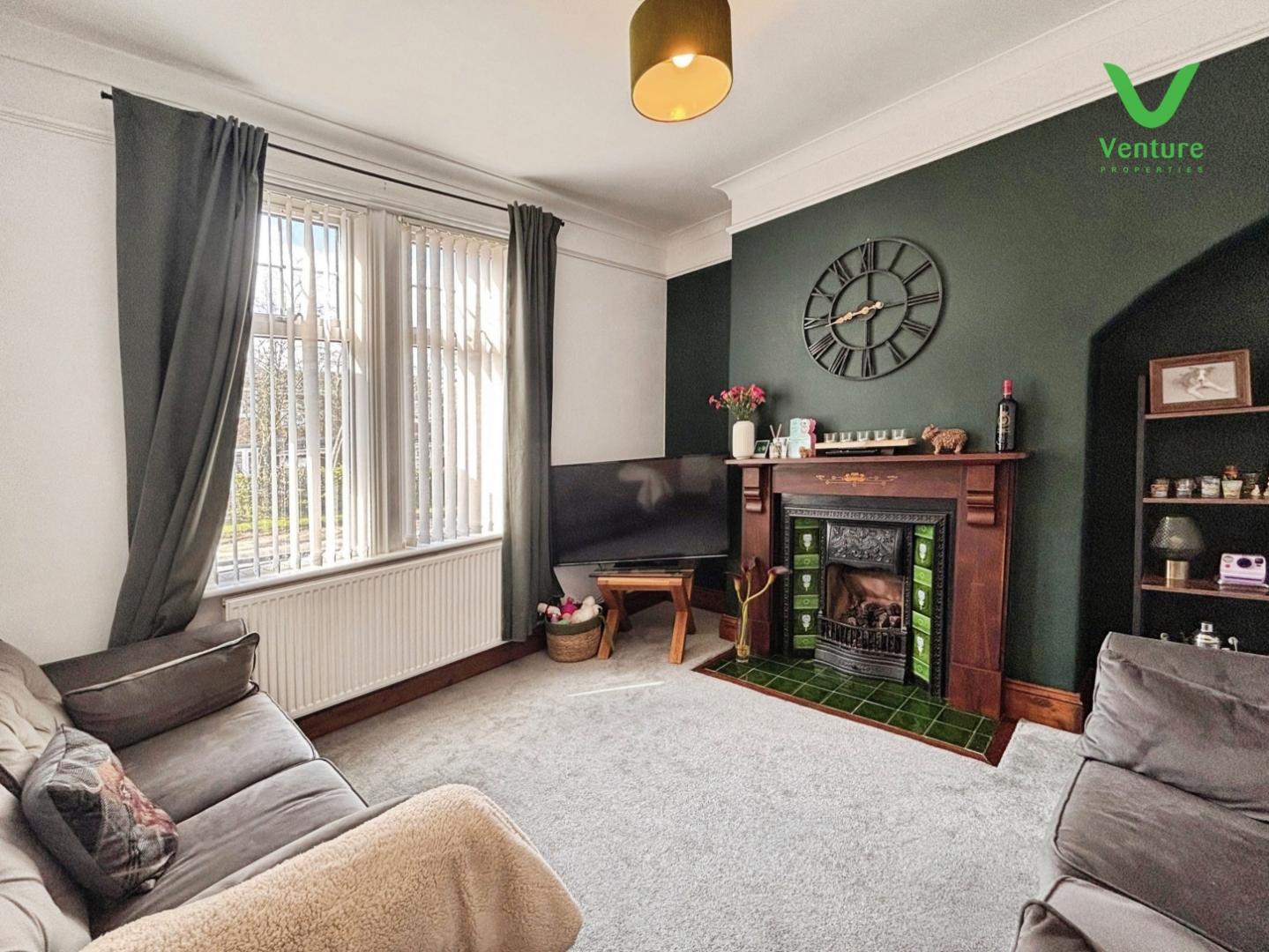 Bright and airy lounge with original feature fireplace with tiled inset and hearth housing gas fire, UPVC window, central heating radiator. Tv point, coving to ceiling, ceiling rose and picture rail.