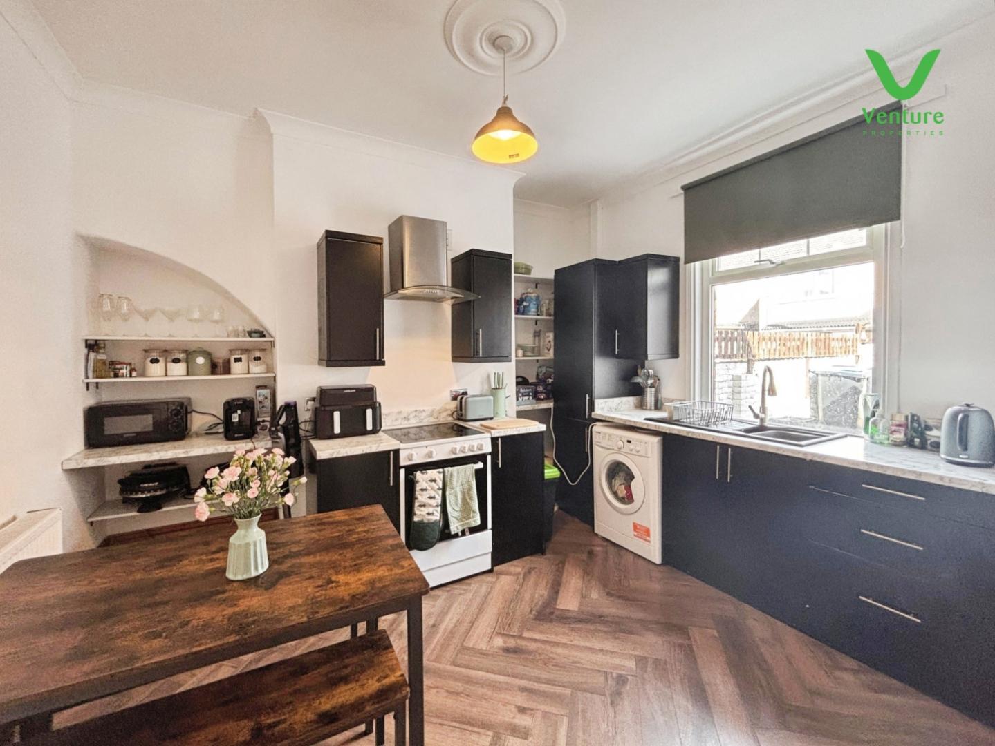 Large modern kitchen with a range of dark wall and base units with contrasting laminate work surfaces over, black steel sink unit with mixer taps, uPVC double glazed window, wood effect laminate flooring, electric cooker point. Double central heating radiator, storage cupboard, concealed wall mounted gas boiler, coving and ceiling rose.