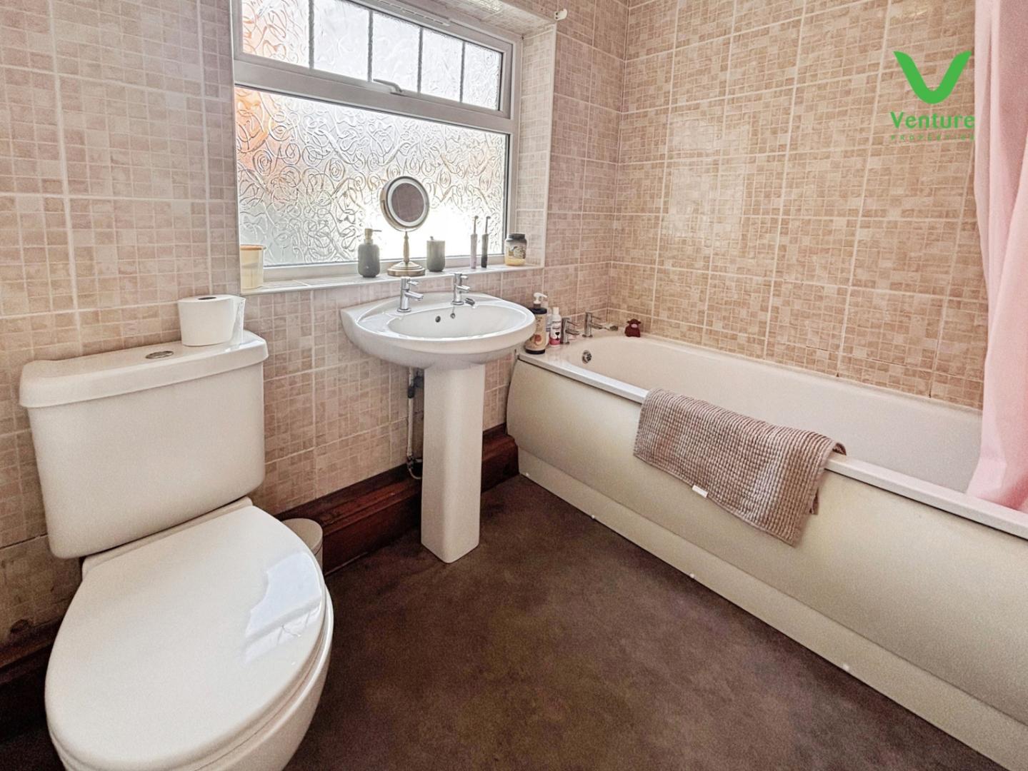Fitted with a white three piece suite including panelled bath with electric shower over and shower screen, fully tiled, wc and pedestal wash hand basin. Opaque UPVC double glazed window.
