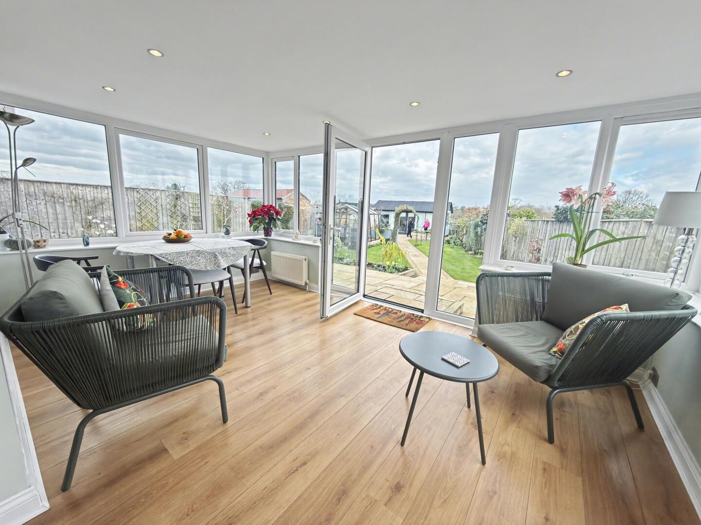 A lovely spacious garden room enjoying the garden views with triple-glazed windows and double doors to rear, two radiators and spotlights to ceiling.