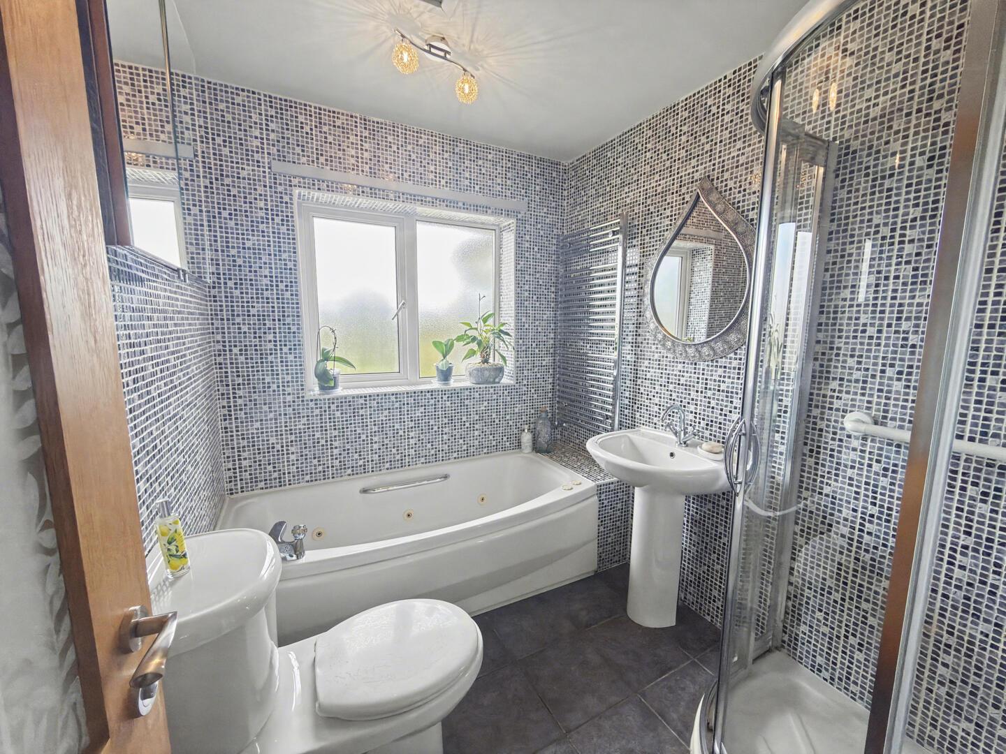 Comprising panelled bath, low level w.c and wash hand basin, heated towel rail, tiled walls and floor with access to large loft space.