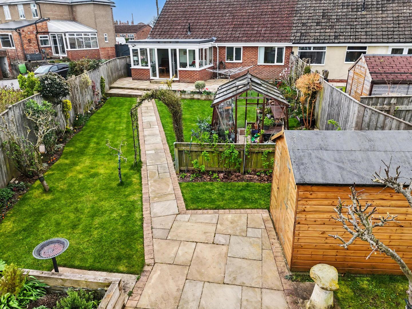 The rear enclosed garden is mainly laid to lawn with Yorkshire stone patio area, well planned and stocked borders including a number of fruit trees, shed, Elton Greenhouse (10'x8) leading to the Summerhouse.
