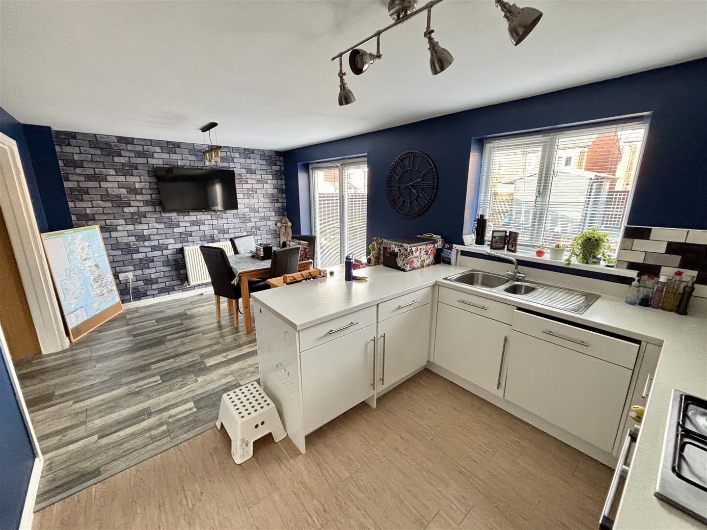 Fitted with a comprehensive range of units having contrasting work surfaces incorporating a stainless steel sink unit with mixer tap, a built in stainless steel oven and gas hob with extractor over, as well as an integrated fridge, freezer and dishwasher. Further features include a radiator, an understairs storage cupboard, a UPVC double glazed window and french doors opening in to the rear garden.