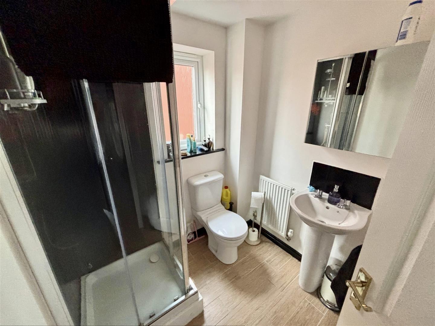 Fitted with a white suite comprising of a cubicle with a mains fed shower, pedestal wash hand basin and WC. Having tiled splashbacks and flooring, a radiator, extractor fan and UPVC double glazed opaque window to the side.