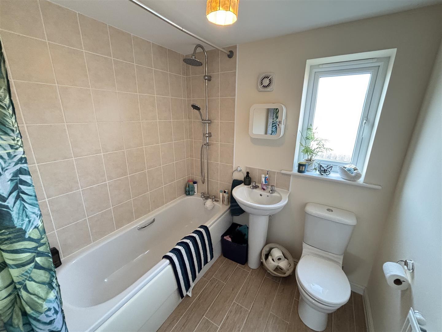 Good sized family bathroom comprising of a panelled bath, pedestal wash basin and WC. Having tiled splashbacks and flooring, a radiator, extractor fan and UPVC double glazed opaque window to the rear.