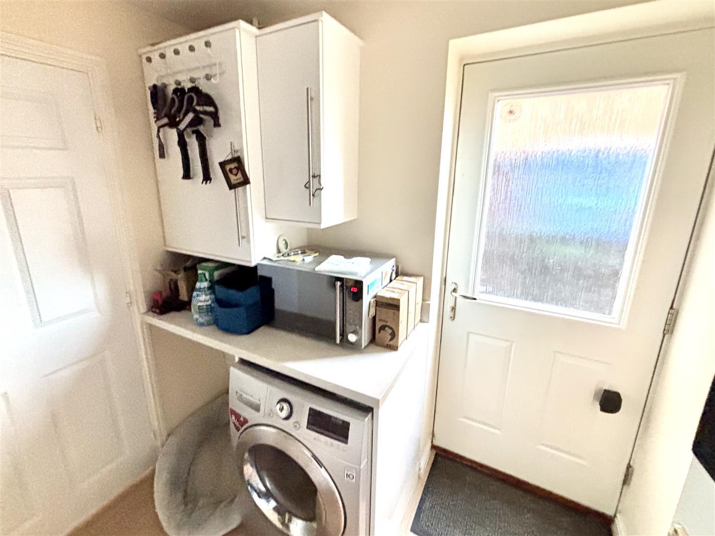 Having co-ordinated units and worktops, wall mounted combi gas central heating boiler, plumbing for a washing machine, radiator and external door to the side of the property.