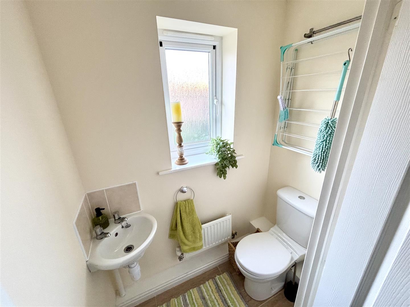 Comprising of a low level WC, hand wash basin with tiled splashbacks, radiator and UPVC double glazed opaque window to the rear.