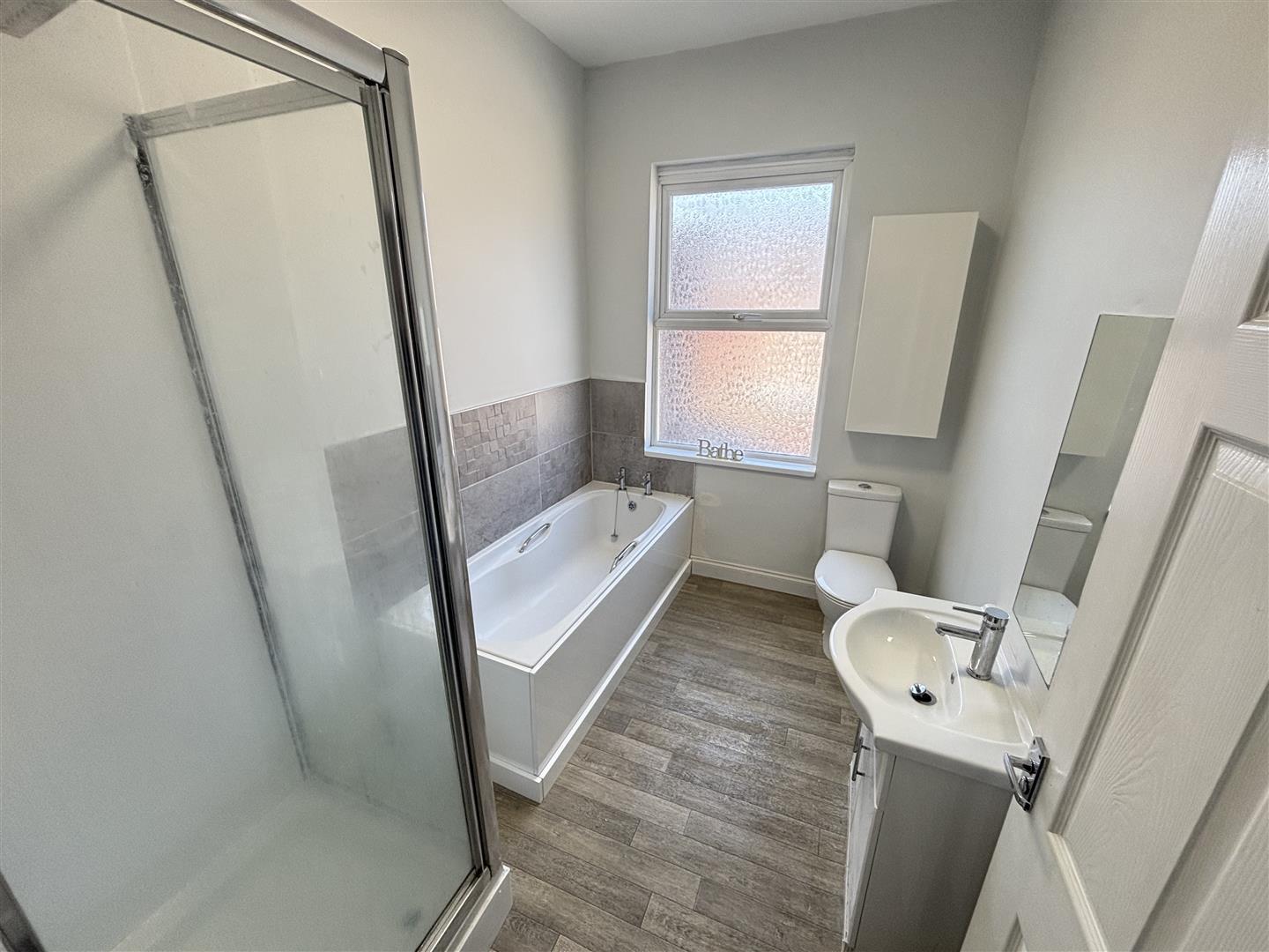 Fitted with a modern suite comprising of a panelled bath, cubicle with mains fed shower, hand wash basin set to a vanity unit and WC. Having a radiator and UPVC double glazed opaque window to the rear.