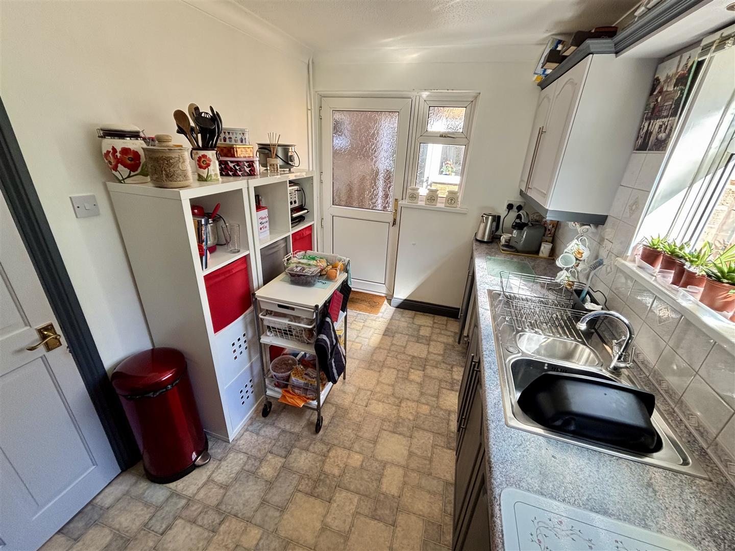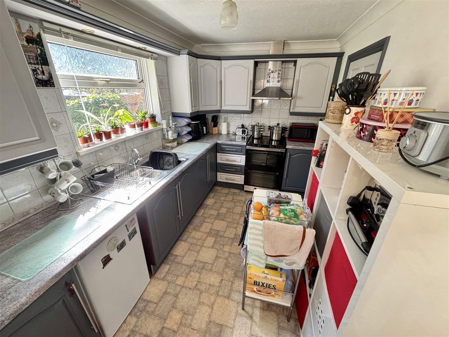 Fitted with a comprehensive range of wall and floor units having contrasting worktops incorporating a stainless steel sink and drainer unit with mixer tap, space for a cooker and extractor fan as well as a fridge/freezer space. Further features include UPVC double glazed windows to the rear and side, a radiator and a UPVC external door to the side.