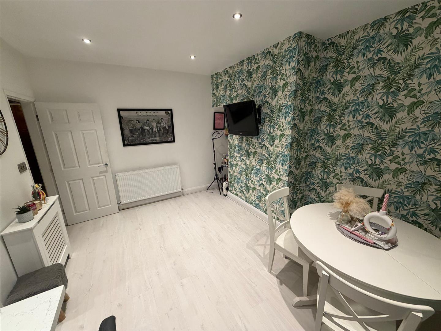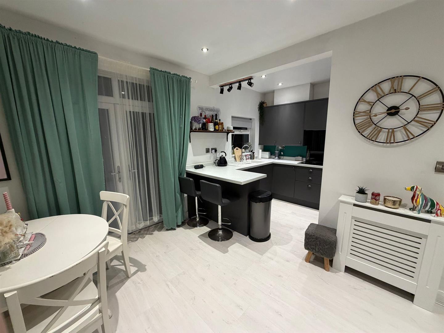 Upvc double glazed window and French doors to rear, fitted with wall, base and drawer units, contrasting worktops with breakfast bar providing casual seating. Integrated sink with mixer tap, electric hob with splashback and eye level integrated oven and microwave. Integrated fridge freezer, dishwasher and spotlights to ceiling. Open aspect to Dining Room area which has plenty of space for a table and chairs. Two radiators.