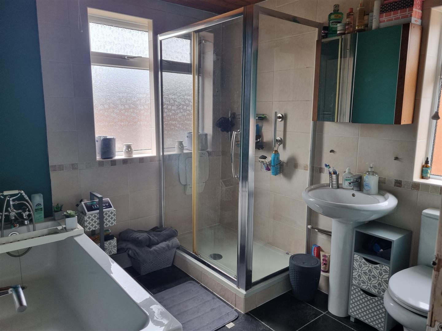 Two Upvc double glazed obscure windows to side and rear, bath with mixer tap and spray. Shower cubicle, wash hand basin and w.c, part tiled walls.