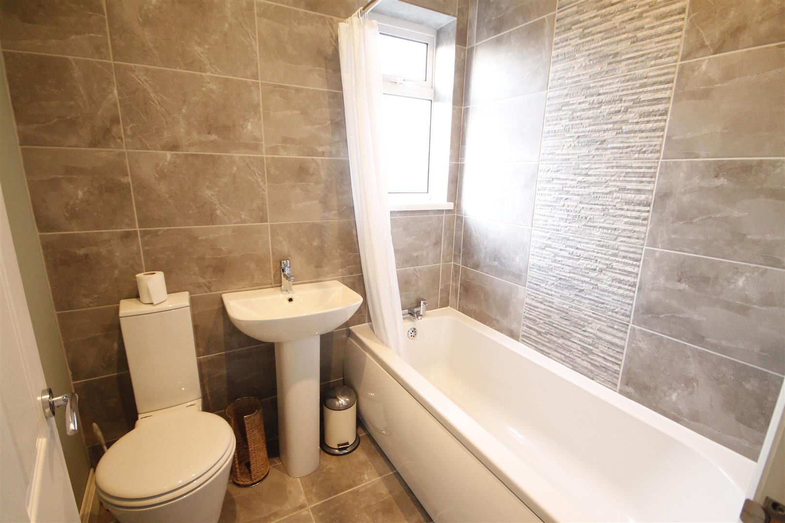 Modern fitted bathroom suite with UPVC opaque double glazed window to rear, suite comprising of low level wc, pedestal wash hand basin, panelled bath with mains fed wall mounted shower, part tiled walls and heated towel rail.