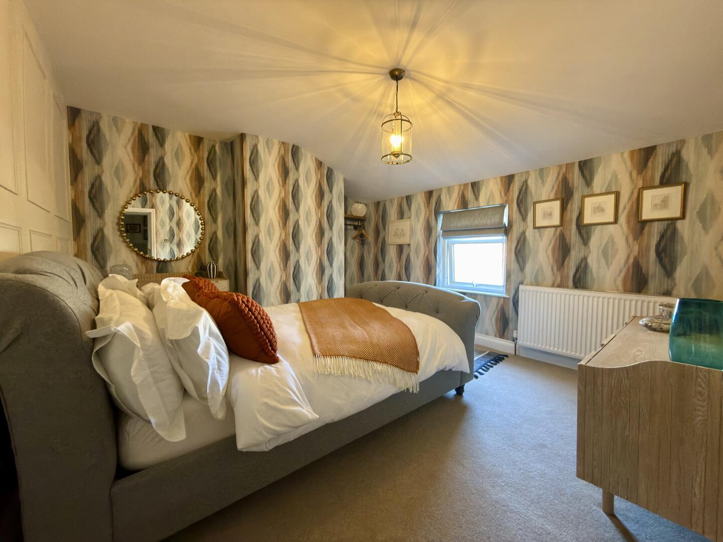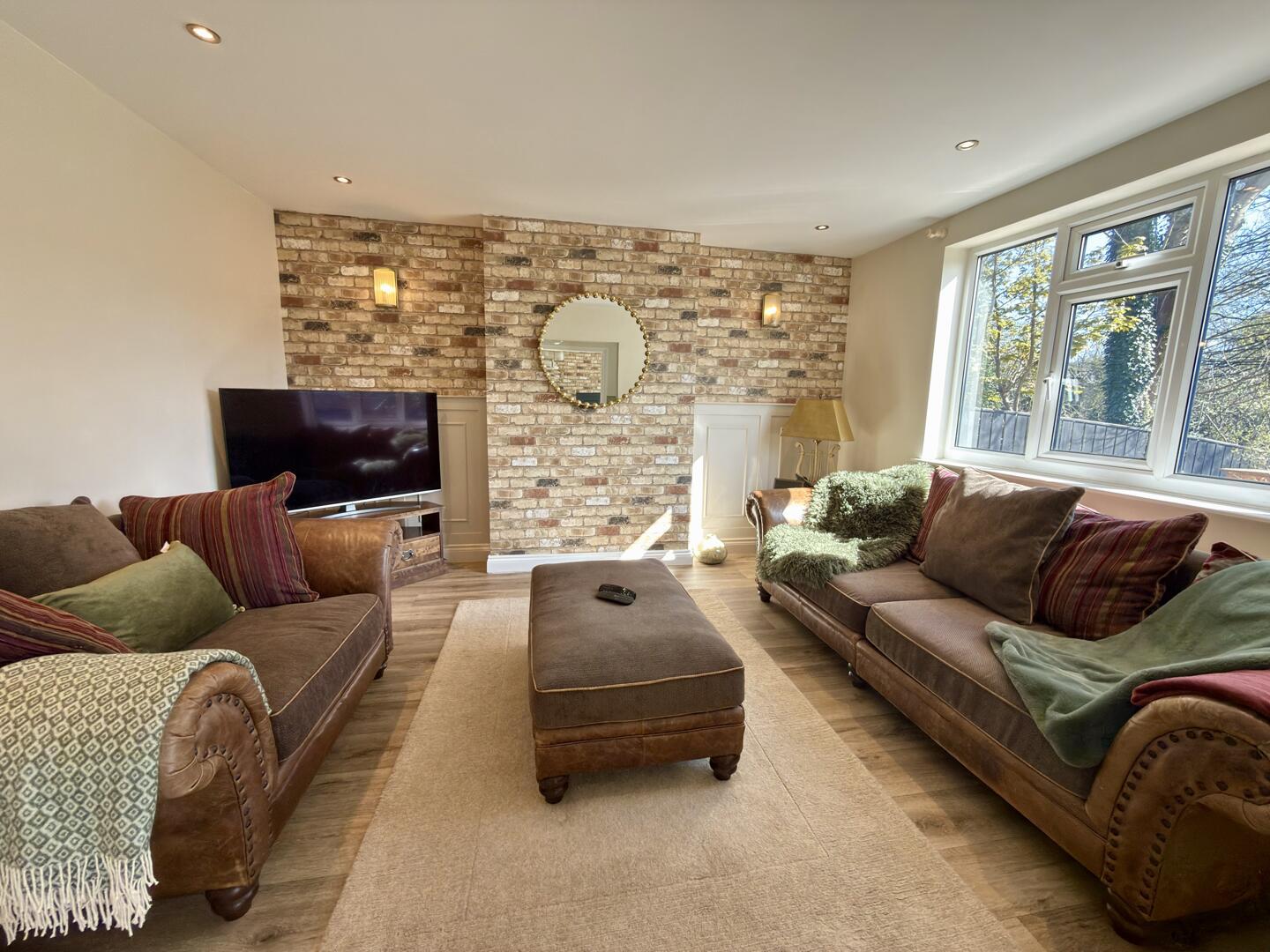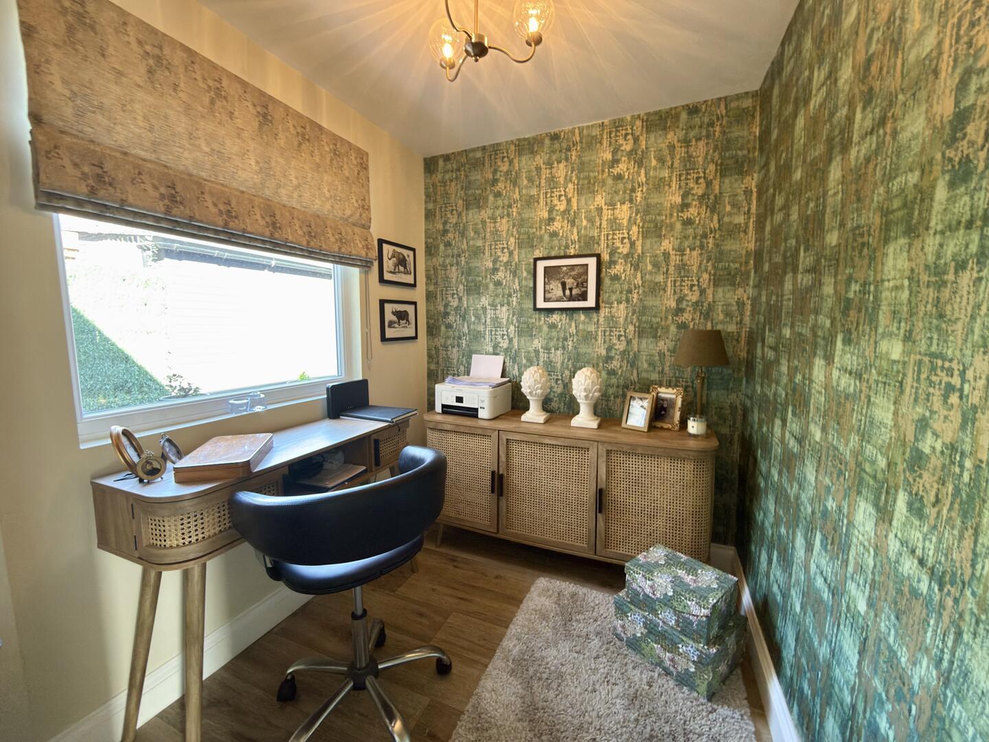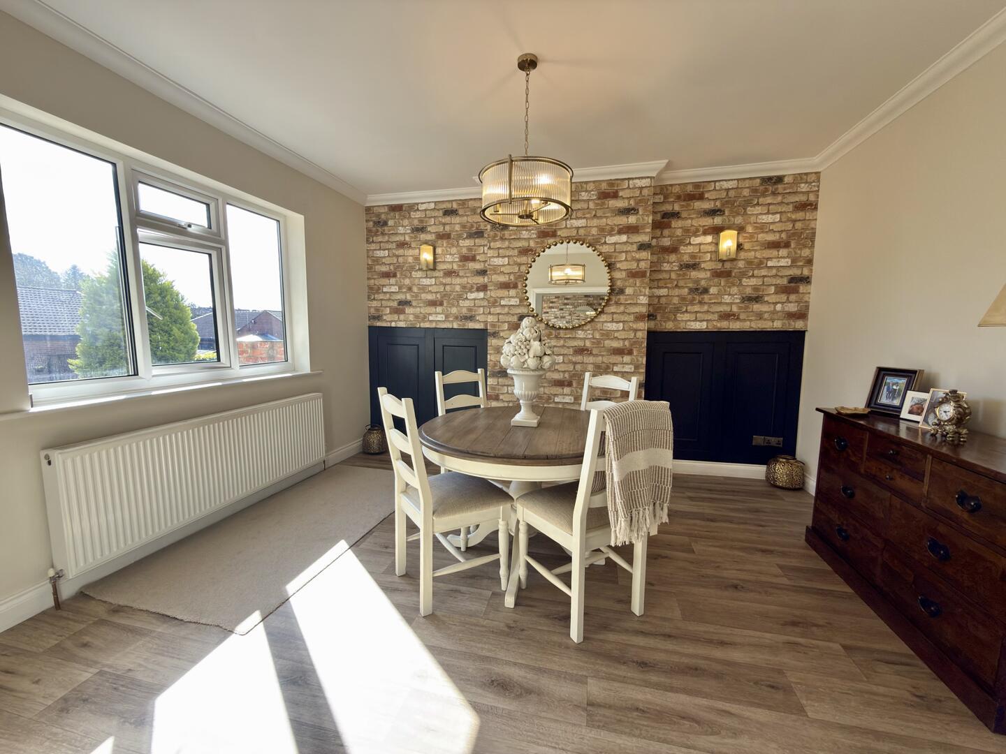 This charming kitchen/breakfast room is welcoming and practical, featuring cream cabinetry and warming wooden countertops. A central island offers extra preparation space and seating for casual dining. The room benefits from natural light and is thoughtfully designed with tiled flooring, arranged in a way that maximises usability and comfort.