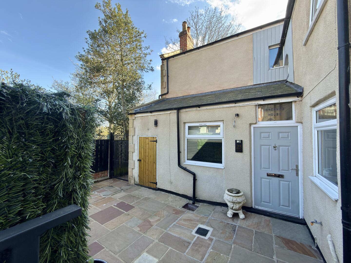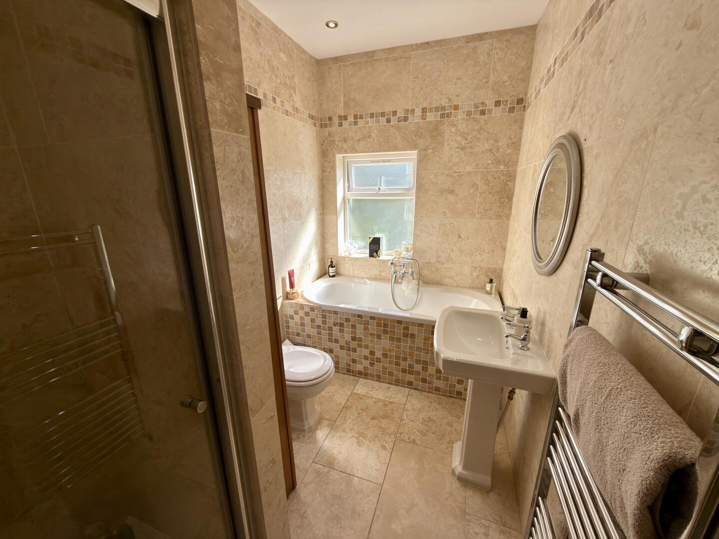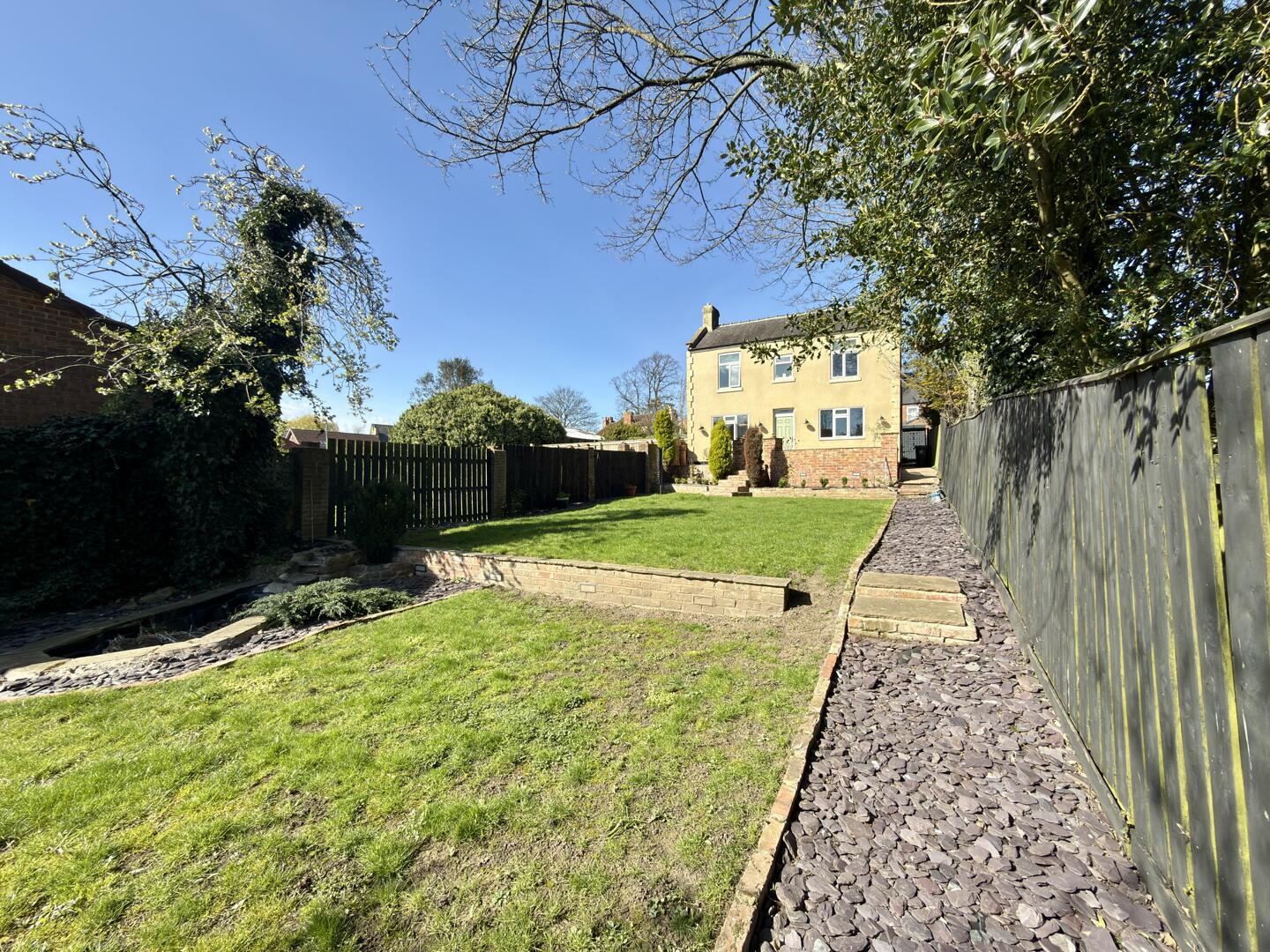 This charming kitchen/breakfast room is welcoming and practical, featuring cream cabinetry and warming wooden countertops. A central island offers extra preparation space and seating for casual dining. The room benefits from natural light and is thoughtfully designed with tiled flooring, arranged in a way that maximises usability and comfort.