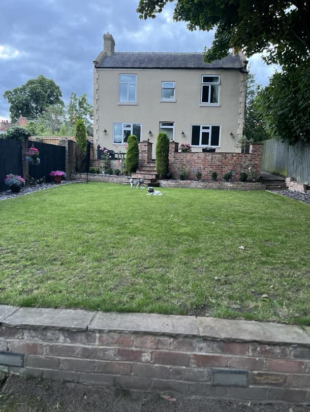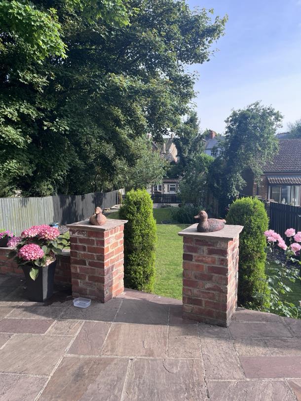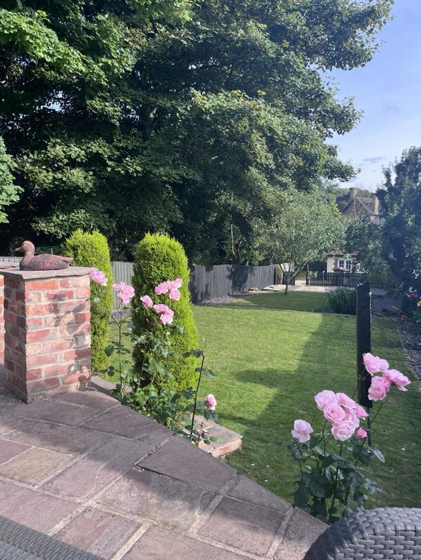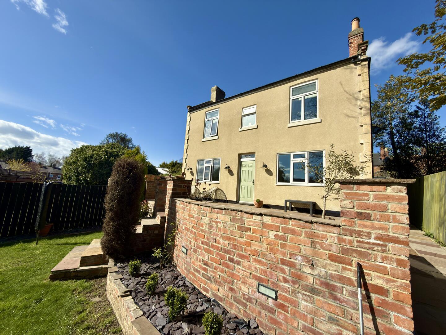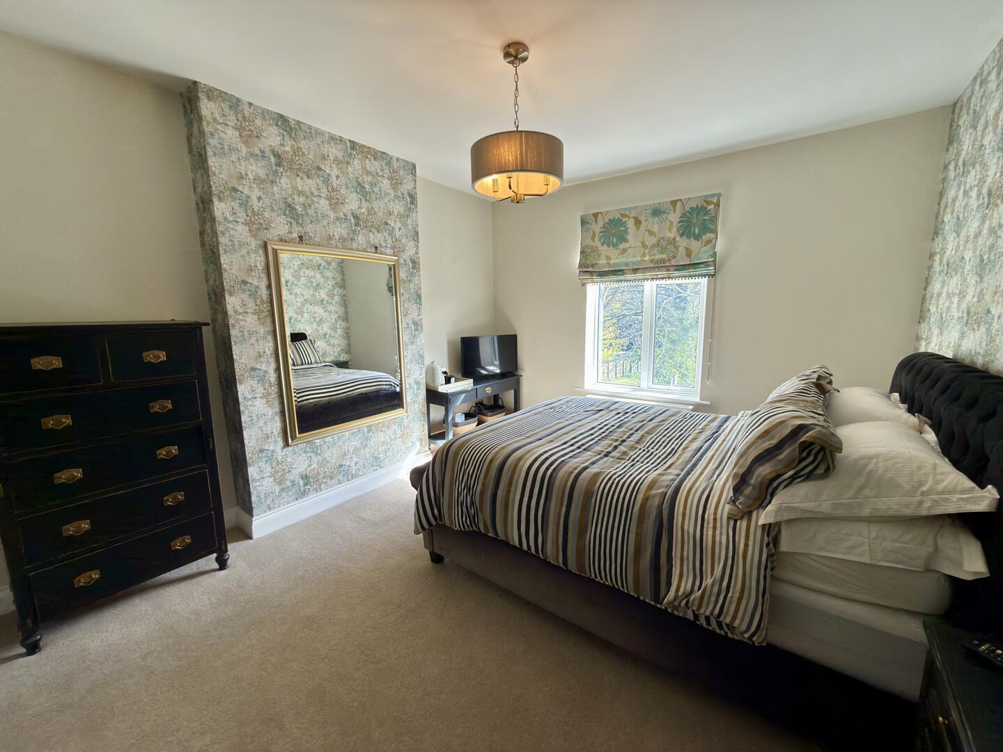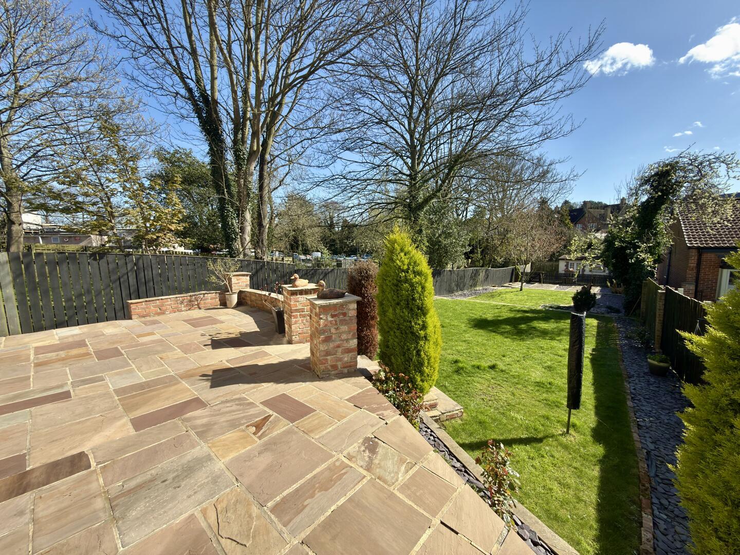 This charming kitchen/breakfast room is welcoming and practical, featuring cream cabinetry and warming wooden countertops. A central island offers extra preparation space and seating for casual dining. The room benefits from natural light and is thoughtfully designed with tiled flooring, arranged in a way that maximises usability and comfort.