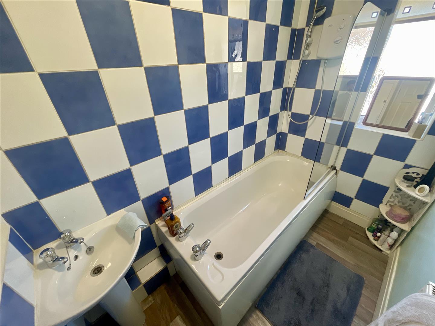 Upvc double glazed obscure window to front, bath with shower over and screen, wash hand basin, storage cupboard and radiator.