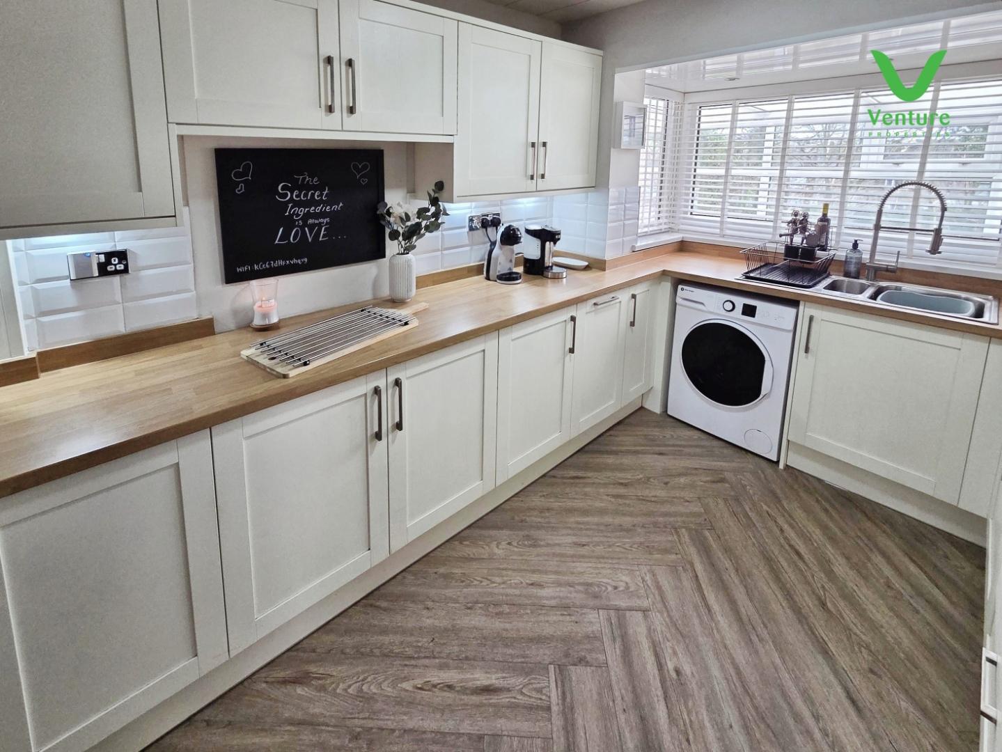 Fitted with a good range of wall and base units having laminate work surfaces over and tiled splash backs, Integrated eye level double oven with separate electric touch hob having extractor chimney over, one and a half bowl sink unit with mixer tap, integrated dishwasher, plumbing for washing machine, central heating radiator and uPVC double glazed window to rear.