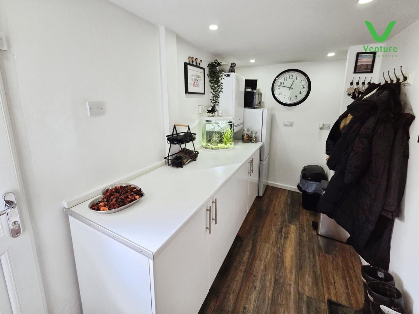 A useful room housing the gas boiler, base units having contrasting work surfaces over, space for a fridge freezer and upvc double glazed entrance door.