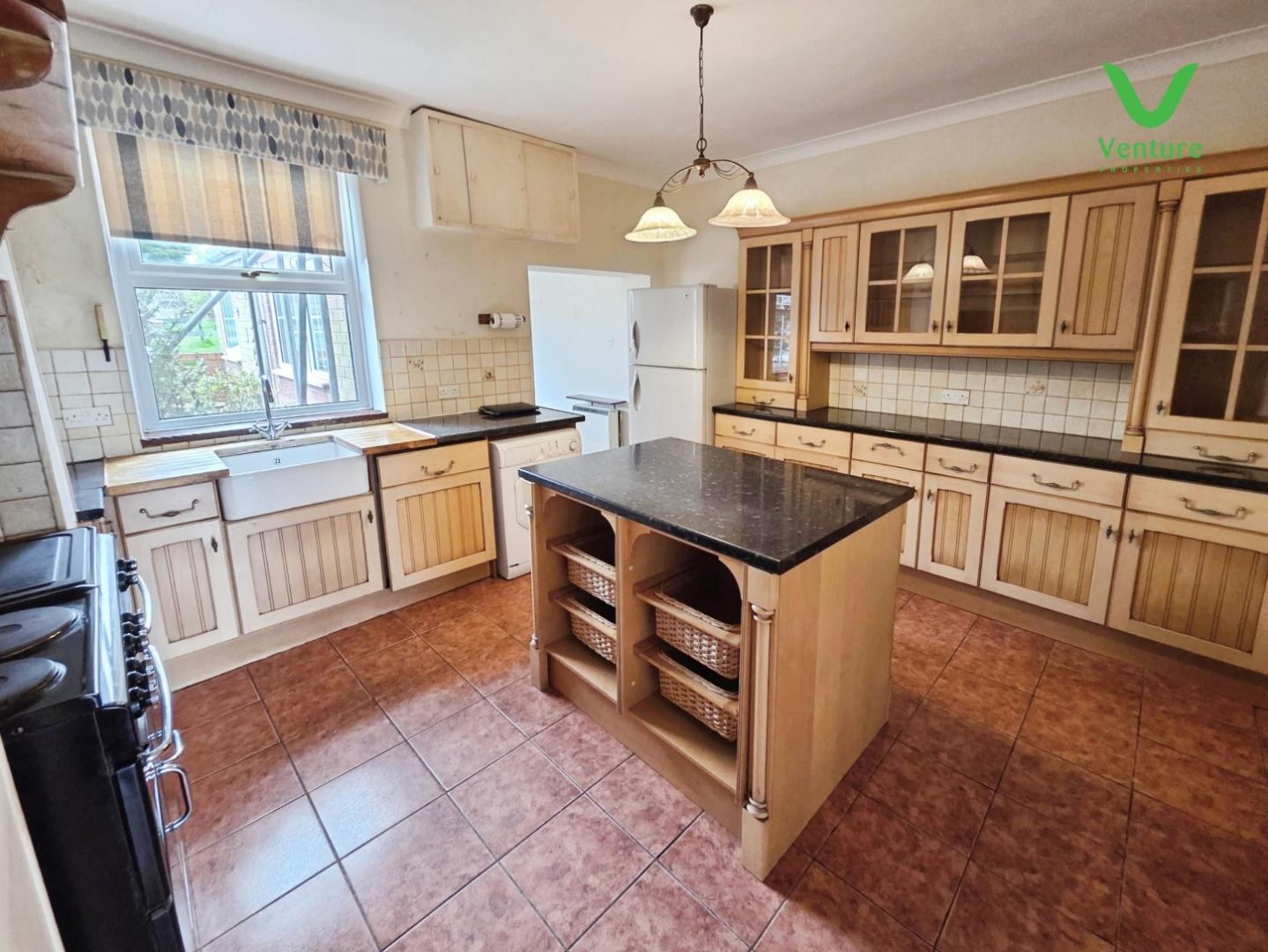 Fitted with wall and base units with contrasting work surfaces over, plumbing for washing machine and Belfast sink unit, central island, tiled flooring and upvc double glazed window to rear.