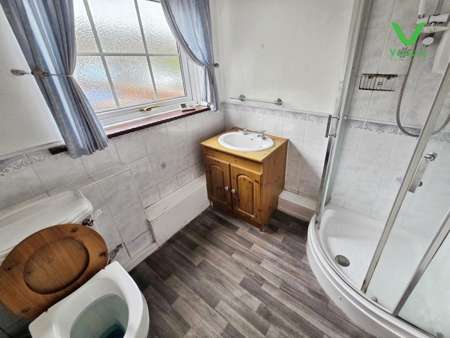 Fitted with a corner shower, wc, wash hand basin and central heating radiator.