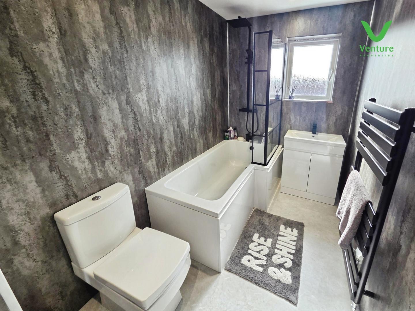 Fitted with a P shaped bath with mains shower over and screen, wc, wash hand basin and black heated towel rail.