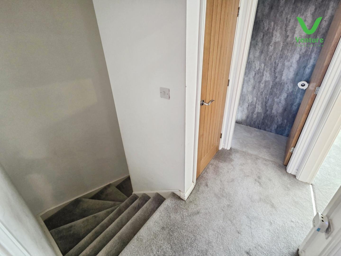 With stairs rising to first floor, laminate flooring and large storage cupboard.
