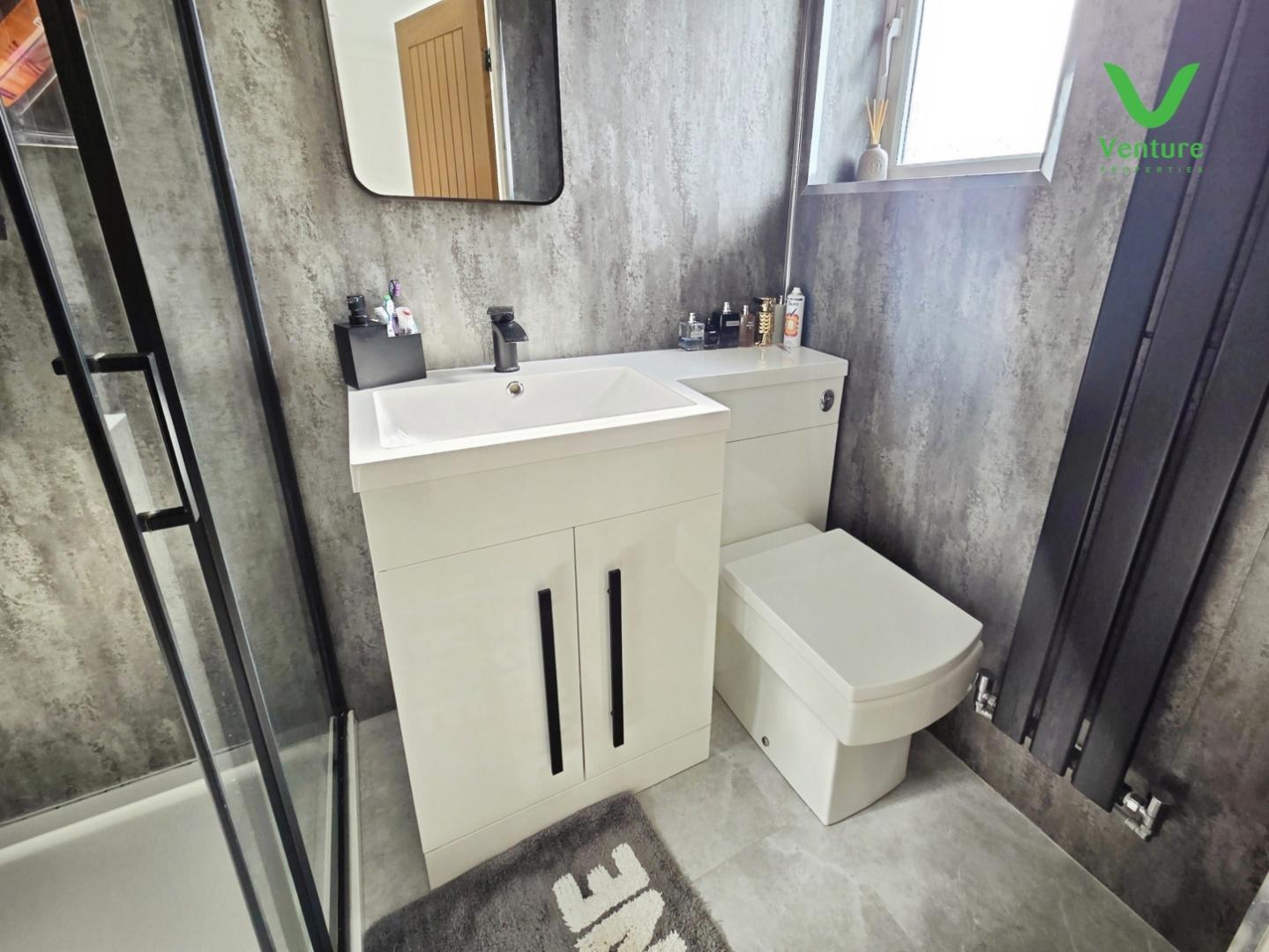 Fitted with a modern suite comprising of double shower cubicle with mains shower over, wc, wash hand basin set to vanity unit and vertical radiator.