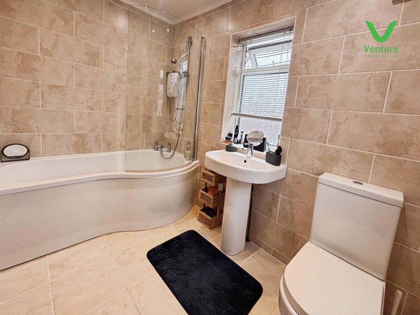 Fitted with a white suite having panelled bath with electric shower over, WC, wash hand basin, chrome heated towel rail and tiled flooring.